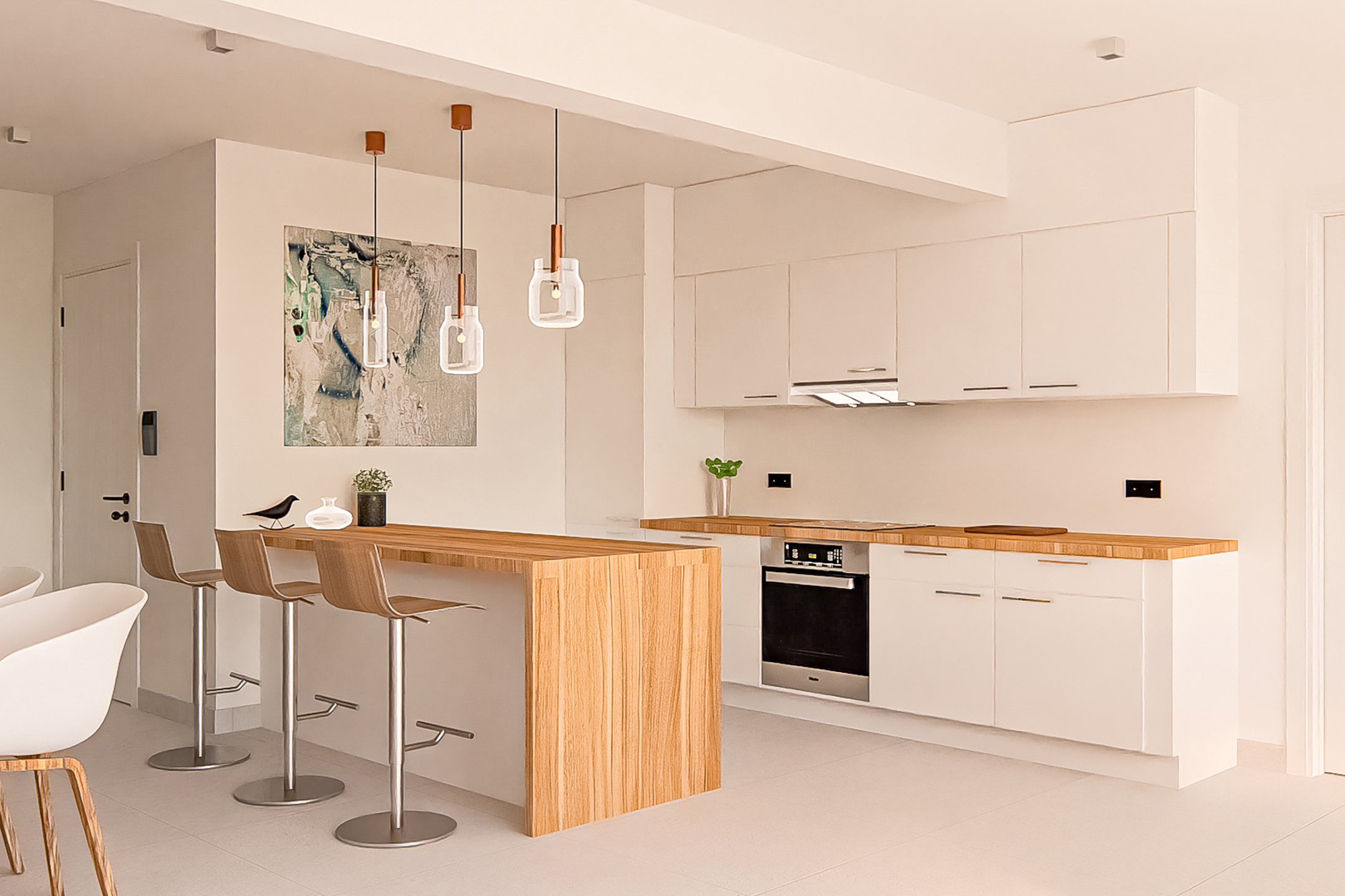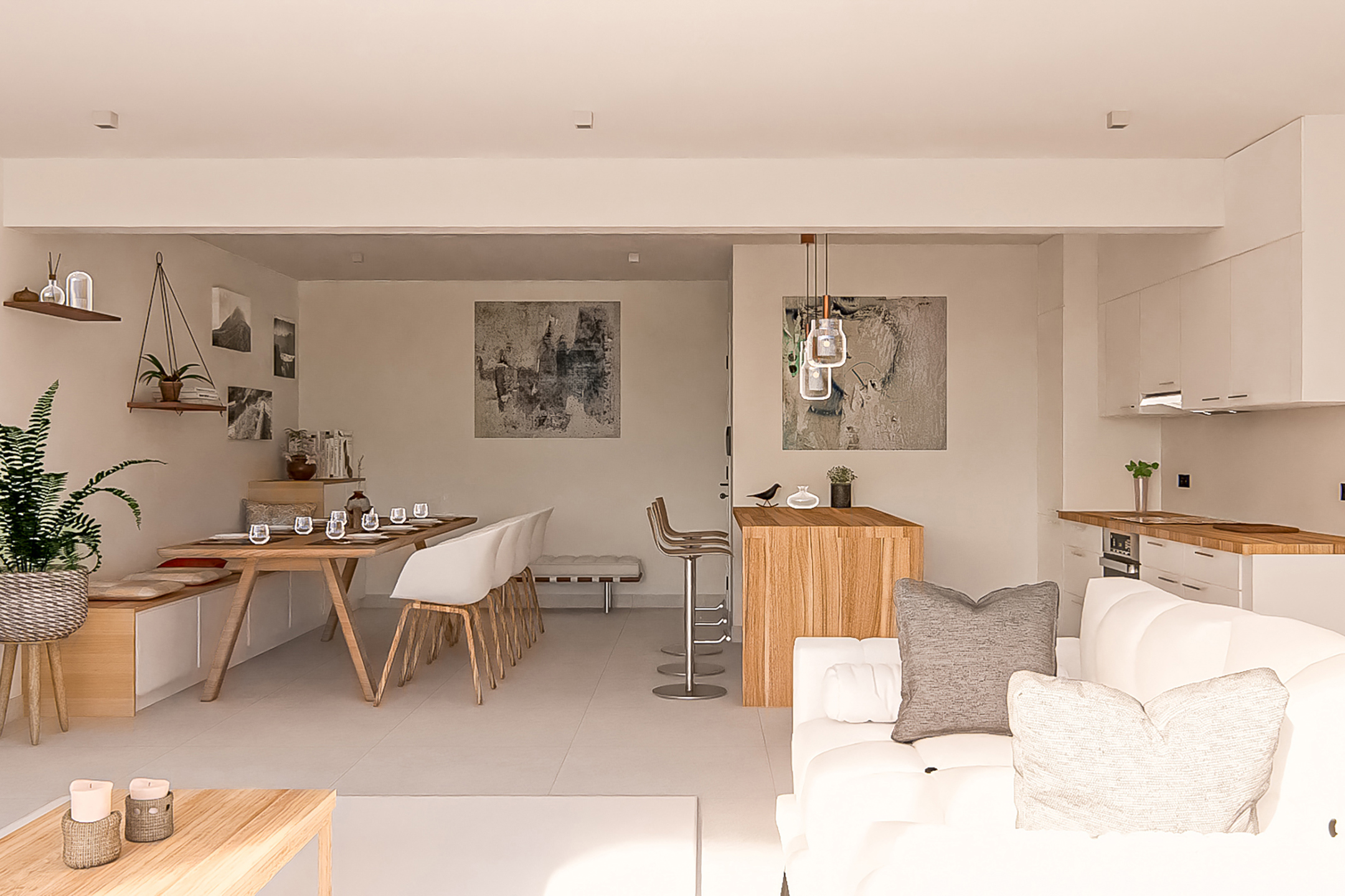 - Menuiseries : isolation thermique et acoustique, châssis double-vitrage en PVC ou en aluminium blancs à l`intérieur et dans les tons gris à l`extérieur, tablettes extérieures des fenêtres en pierre naturelle ou équivalent, portes intérieurs prêtes à peindre avec encadrement en bois,