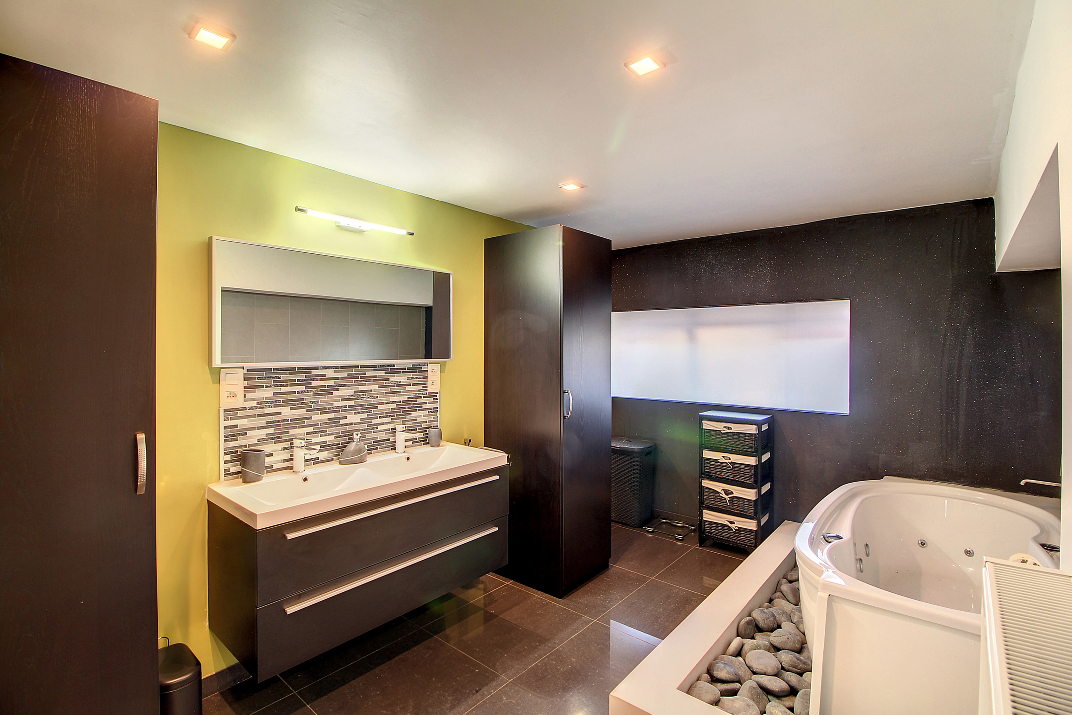 Cet étage dessert également une première salle de bains avec une douche à l’italienne, une baignoire et un meuble lavabo. Un WC suspendu séparé avec lave-mains, un dressing, un bureau et une buanderie bien aménagée avec dévidoir.