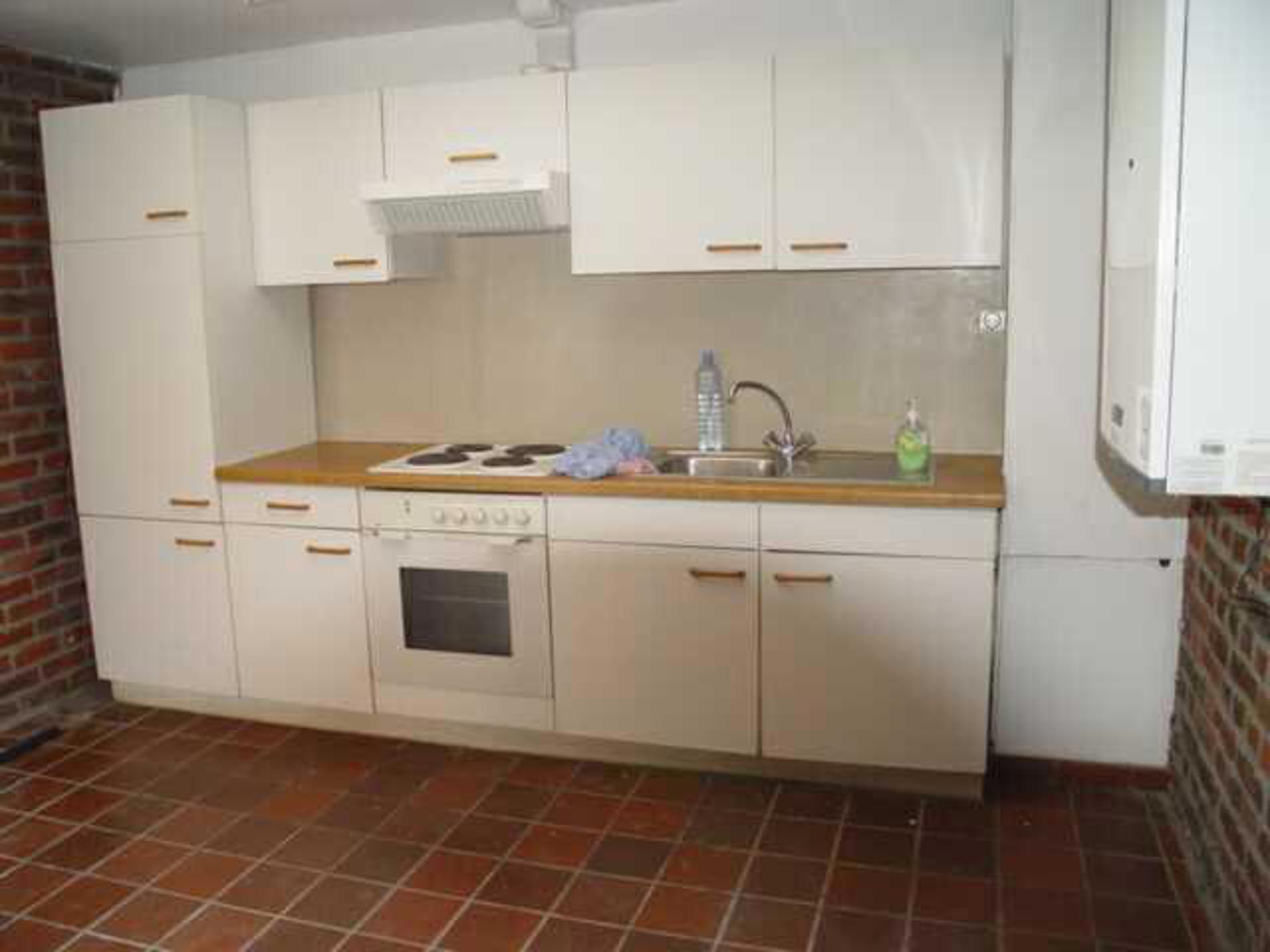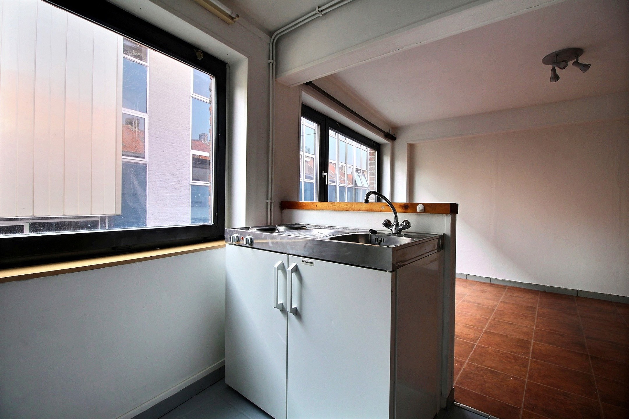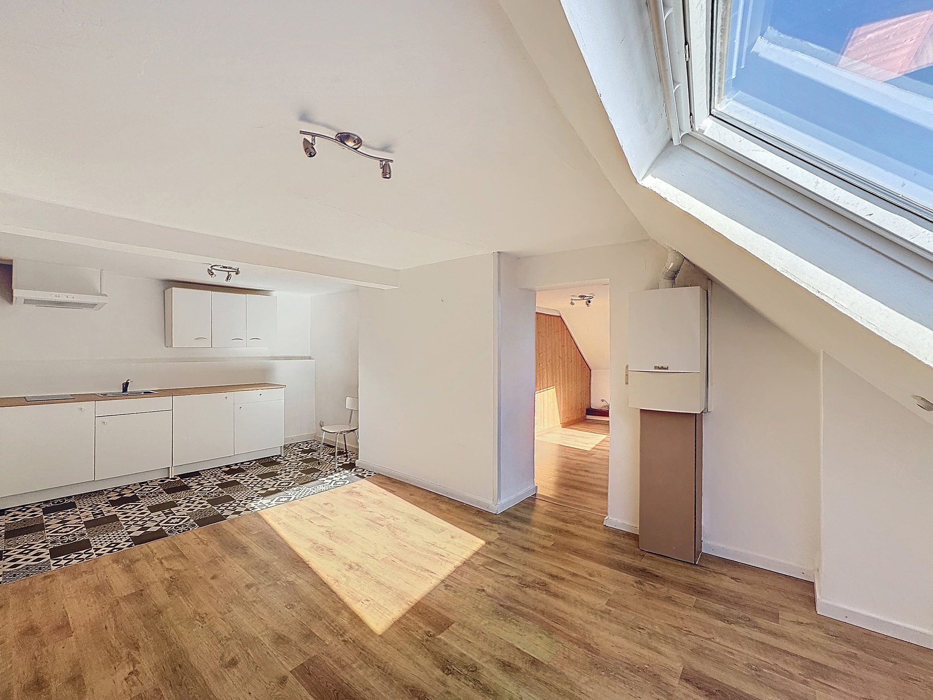 Premier appartement : Séjour de +/- 25m2 avec cuisine semi-équipée, une salle de bains composée d’une douche et d’un meuble lavabo, un WC et une chambre à coucher