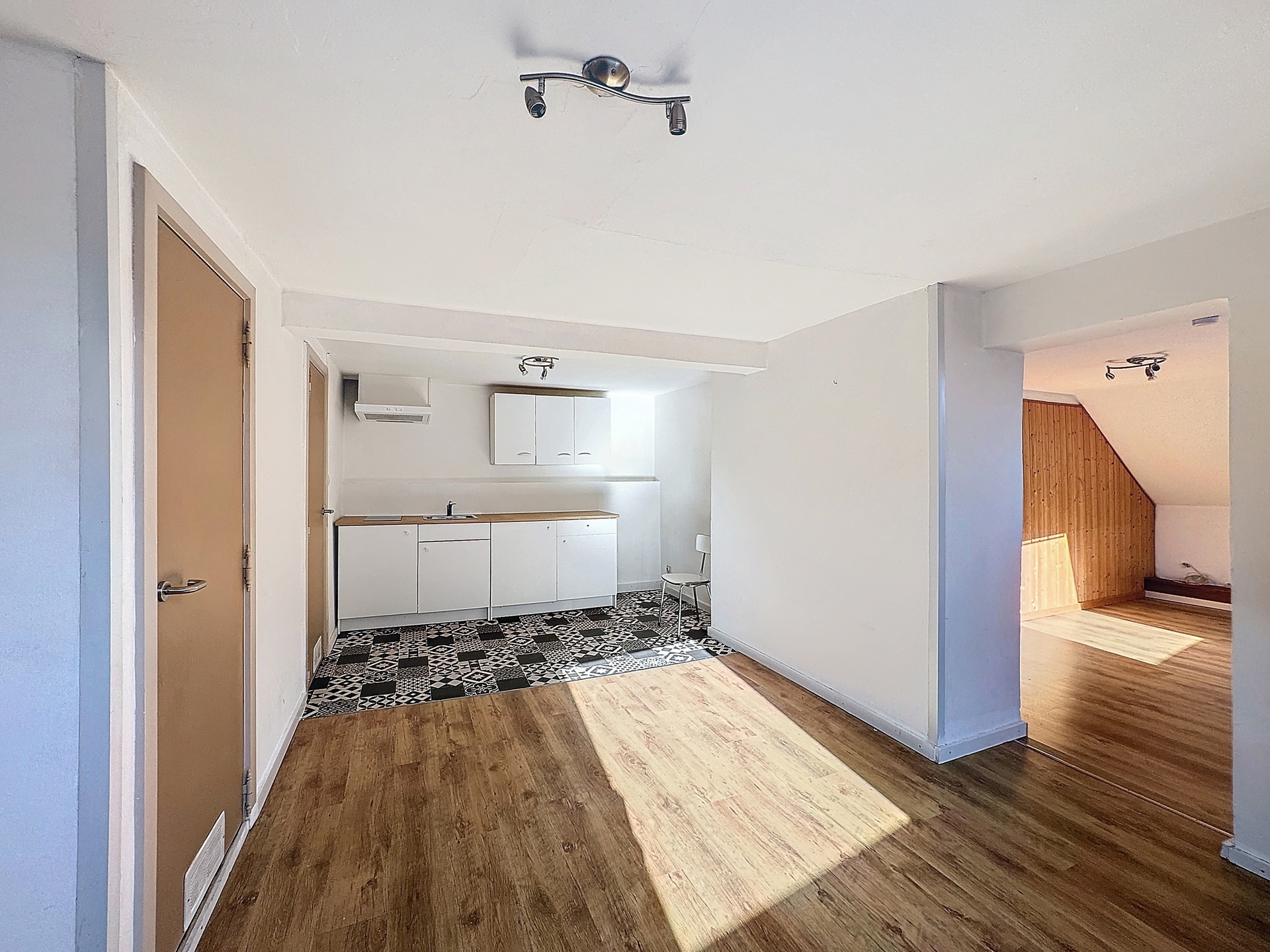 Troisième appartement : Lumineux séjour (salon et salle à manger), nouvelle cuisine avec plaque de cuisson, hotte, rangements, une salle de bains avec douche et meuble lavabo, un WC séparé et une chambre à coucher. Actuellement loué 415€/mois + 30 de charges