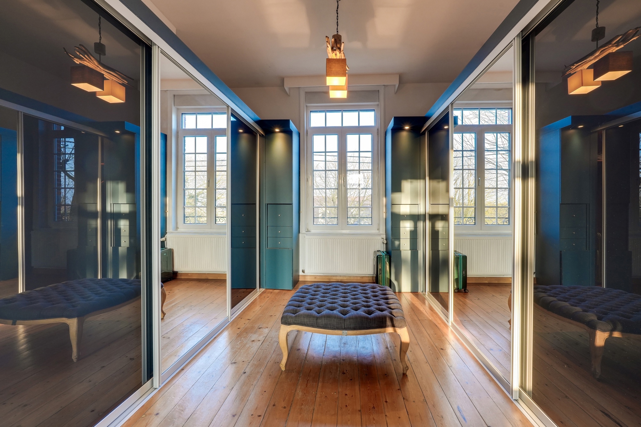 Au premier étage, un pallier mène à une grande chambre parentale avec dressing sur mesure, offrant un espace de rangement optimal. Vous y trouverez également une salle de bain raffinée, équipée d`une baignoire, d`une douche, d’un WC et d`un lavabo double vasque. Une pièce polyvalente, idéale pour un bureau ou une chambre, complète ce niveau.