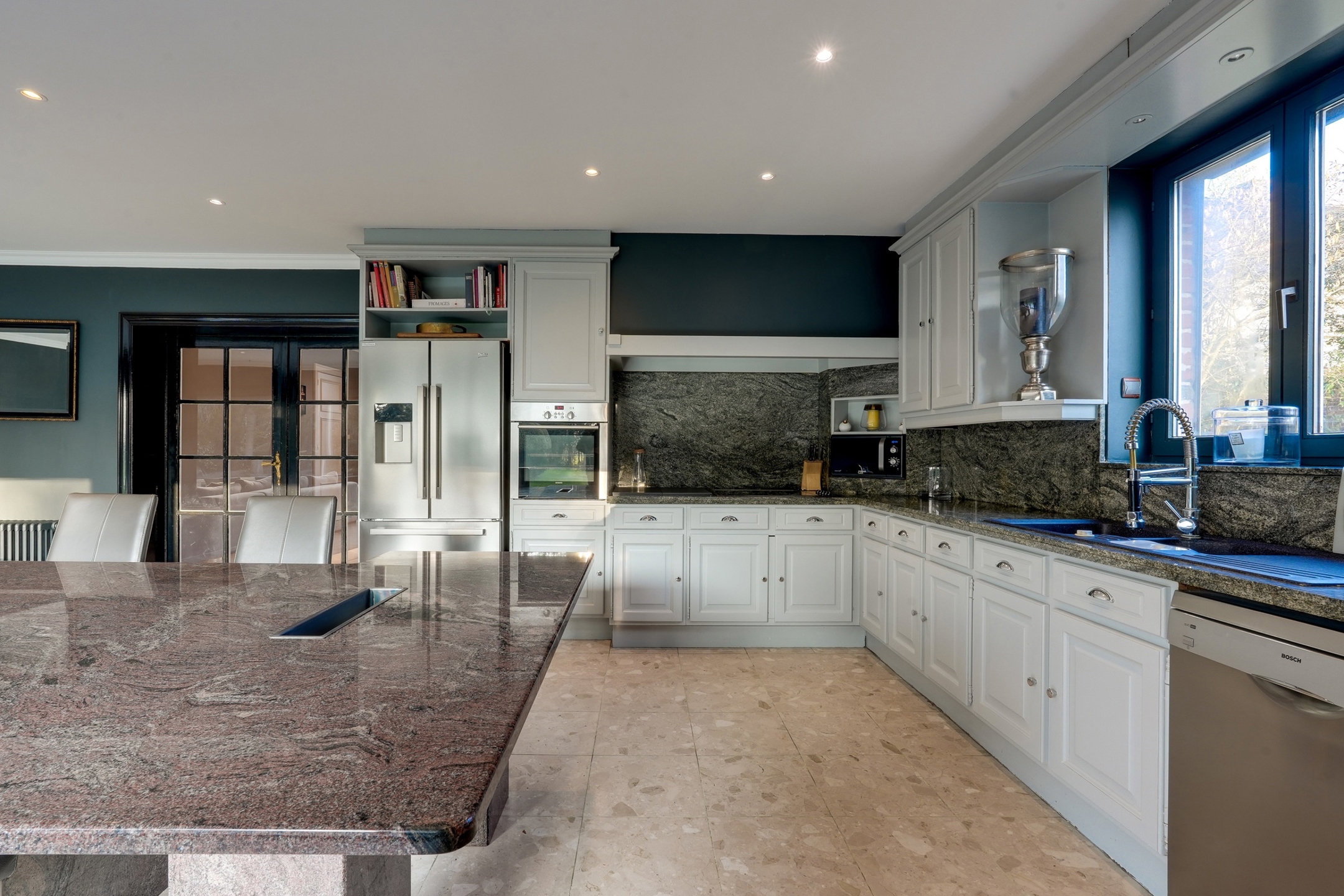 Au rez-de-chaussée, vous serez accueilli par un hall d`entrée spacieux qui distribue un bureau et un premier salon sur la droite. À gauche, une belle salle à manger conviviale s`ouvre sur une vaste pièce de vie, comprenant une cuisine entièrement équipée et un grand salon lumineux, offrant une vue sur le jardin.