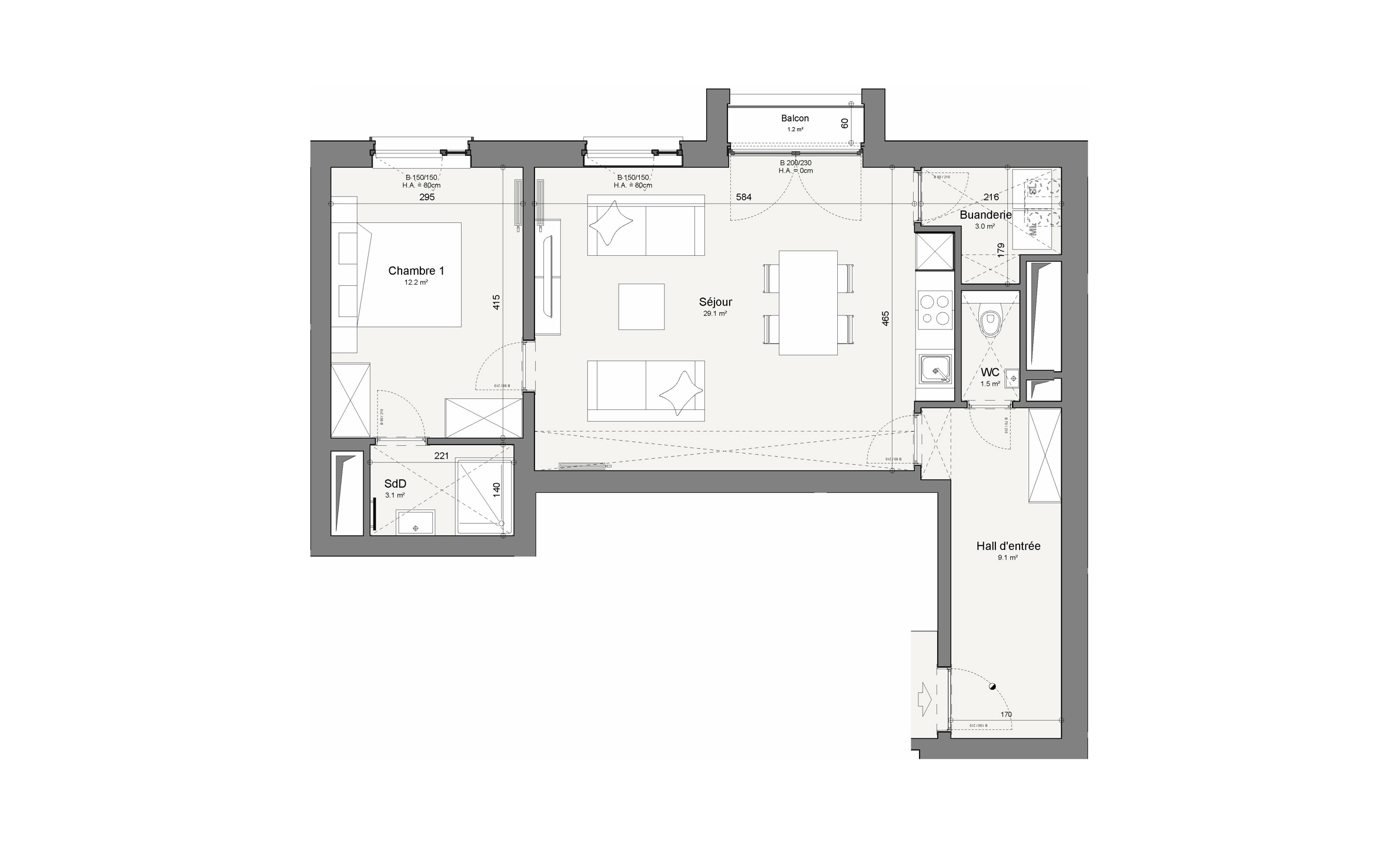 - Agencement : hall d`entrée, séjour avec cuisine ouverte, 1 chambre, salle de bain avec douche, buanderie et WC séparé