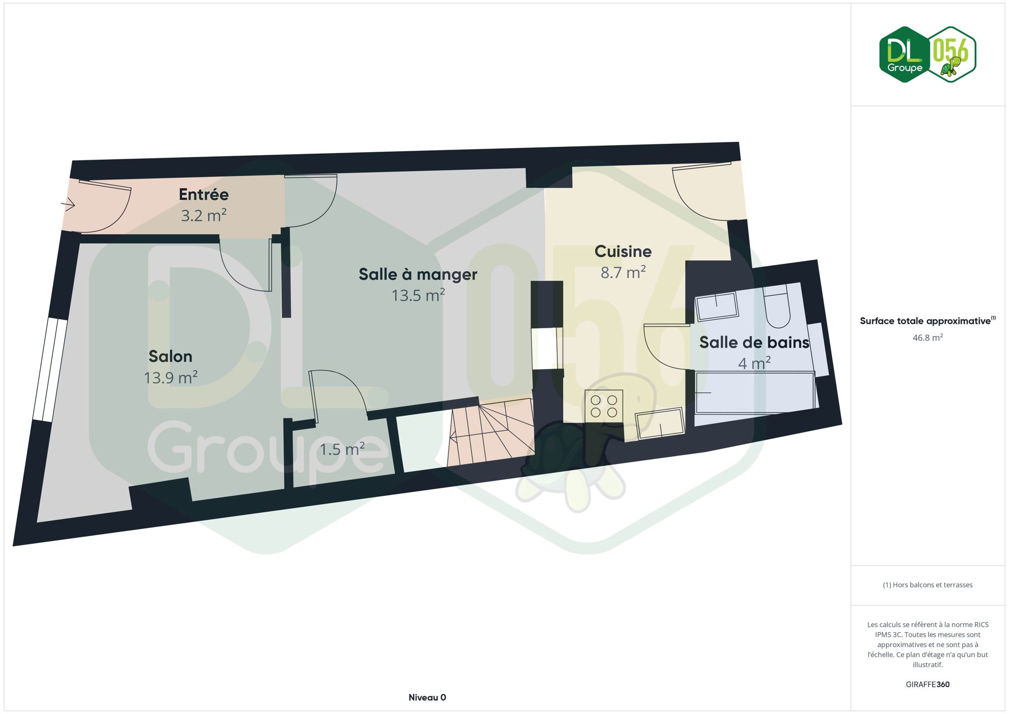 Hall d`entrée, séjour avec salon et salle à manger. Espace de stockage sous l`escalier;