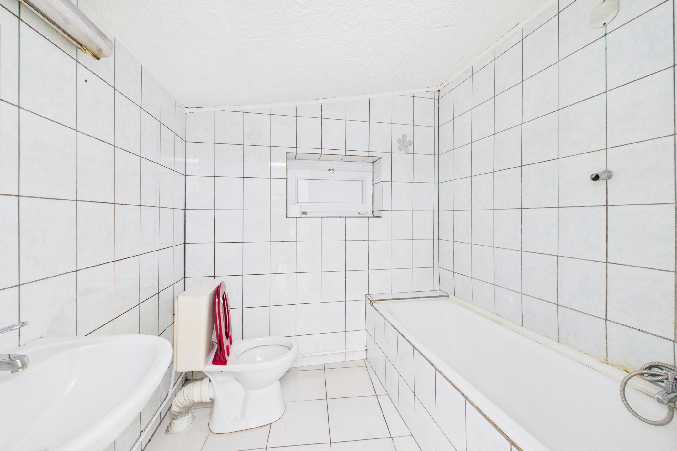 Salle de bain faïencée avec baignoire, lavabo et wc