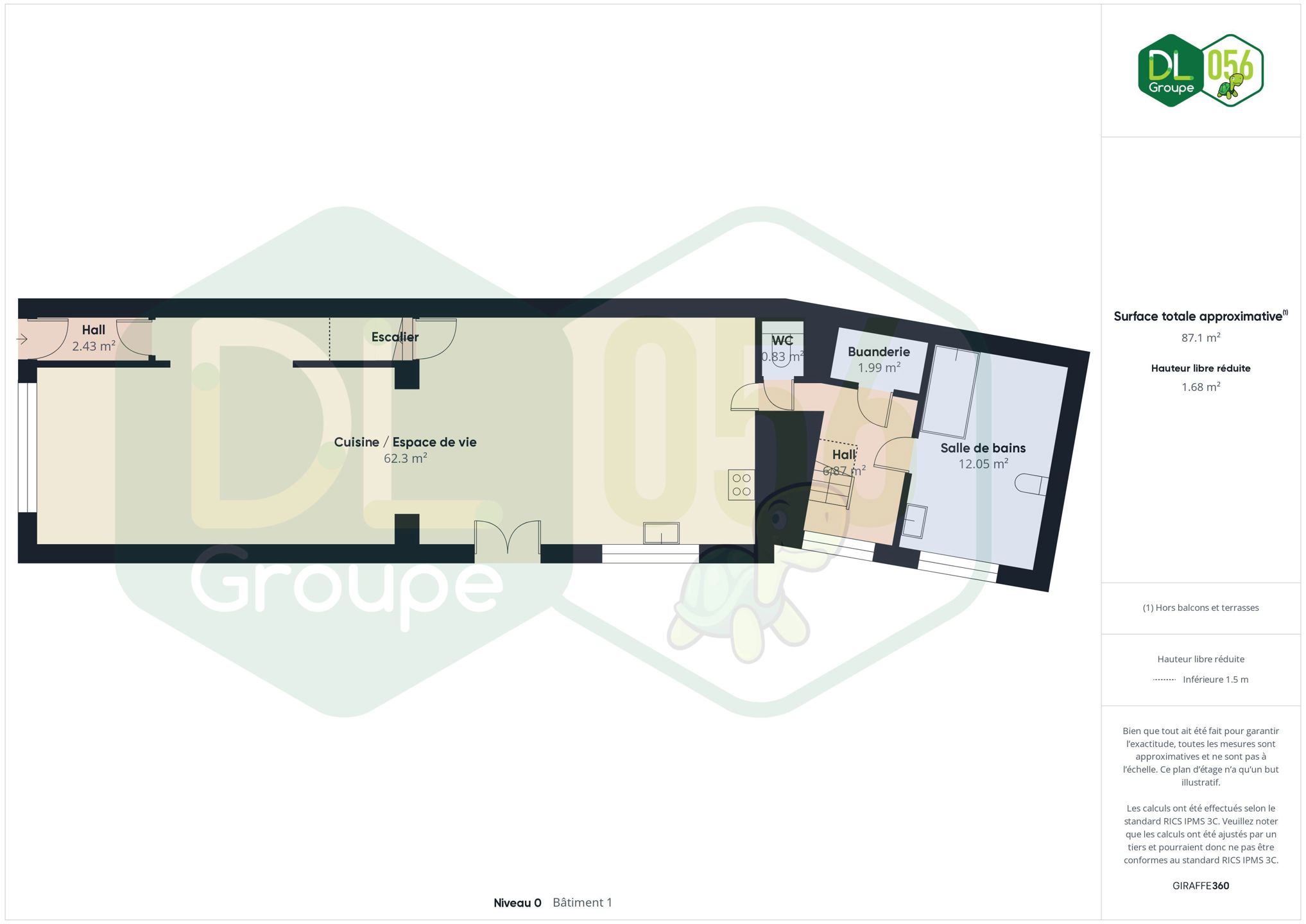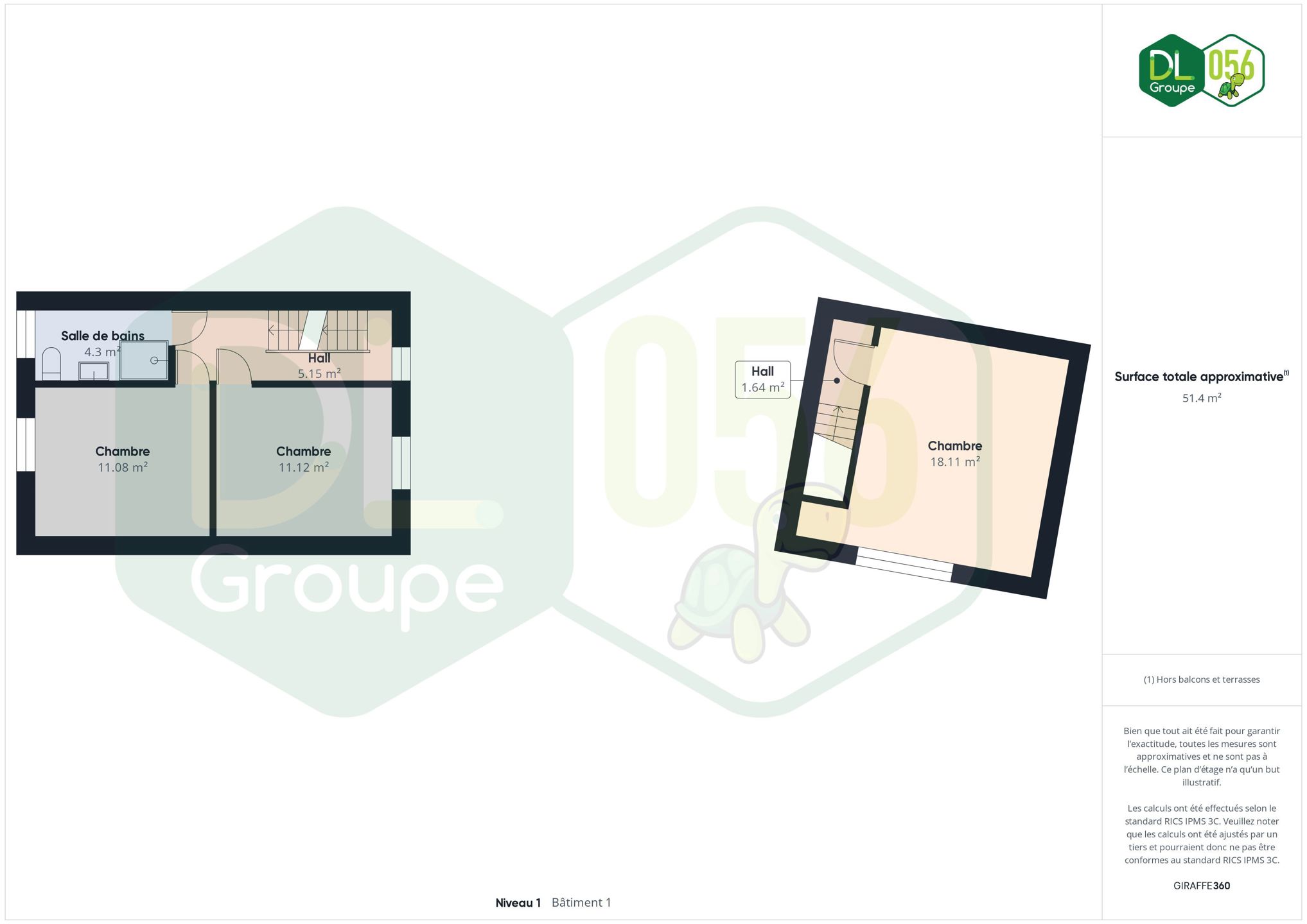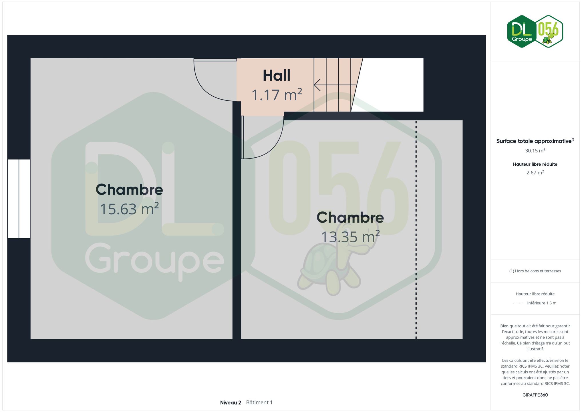 Au 2e étage : hall de nuit et 2 chambres supplémentaires, accessibles par escalier fixe.