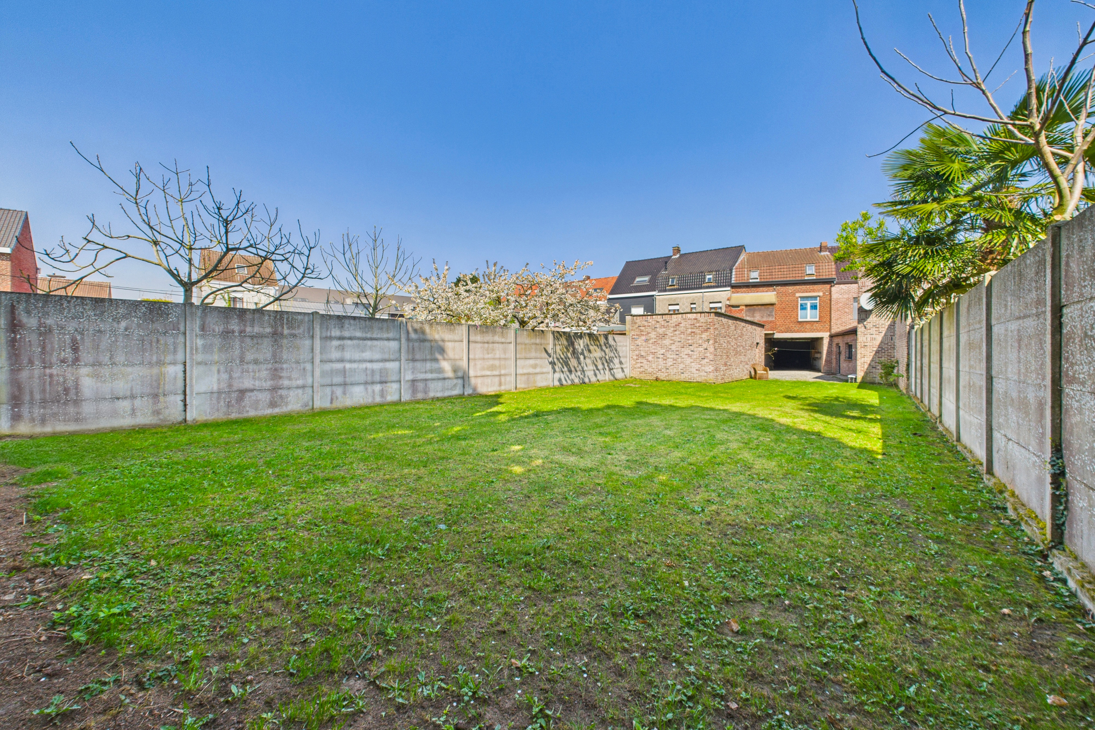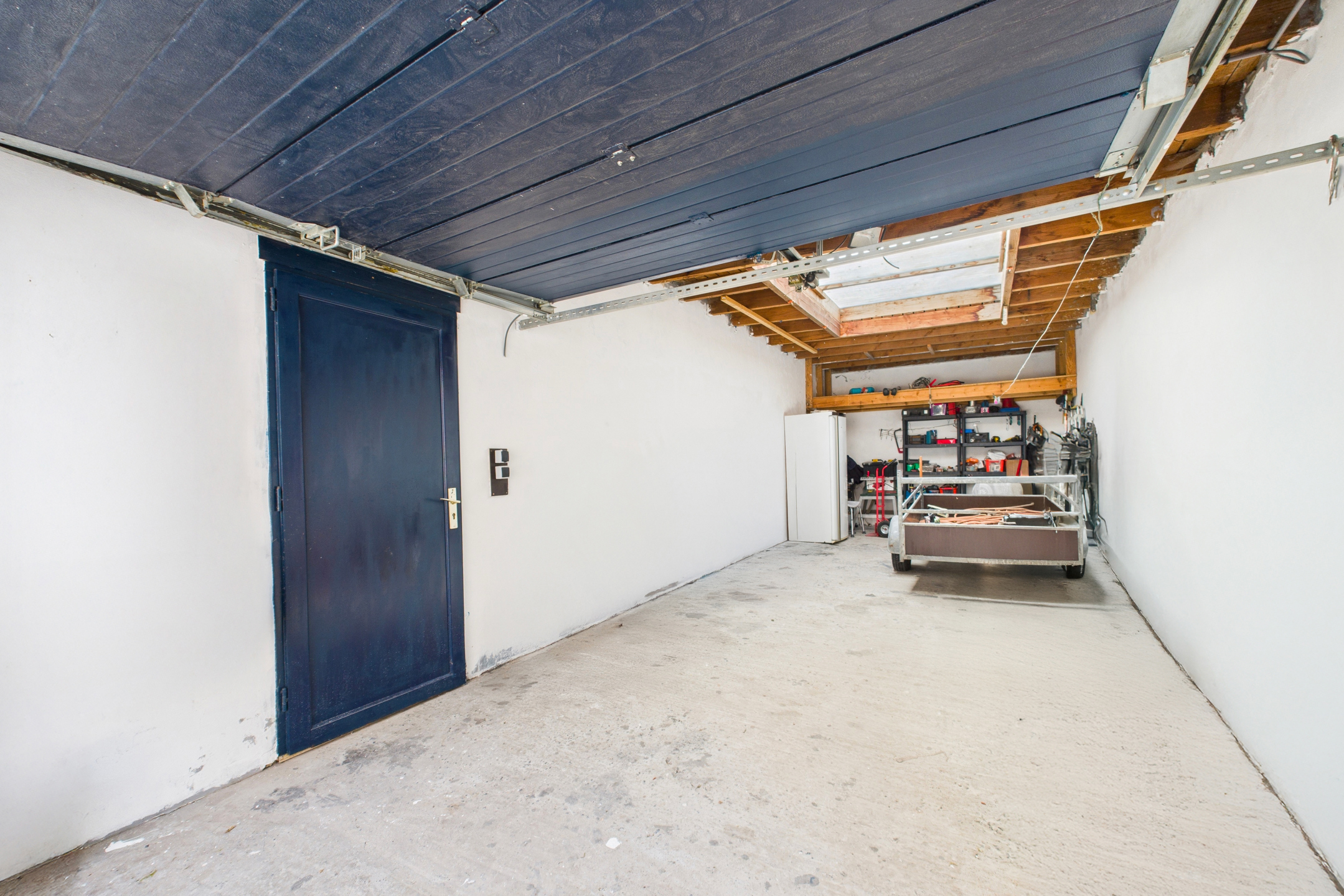 Extérieur : premier garage ouvert menant à une grande terrasse pavée et un jardin clôturé exposé sud-ouest, sans vis-à-vis. Second garage fermé.