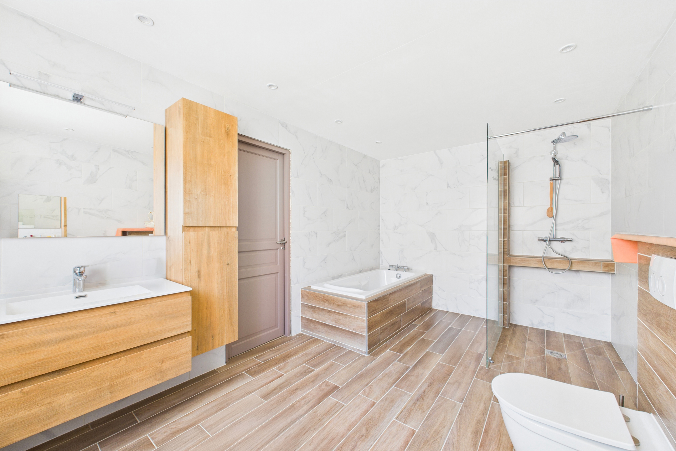 Au rez-de-chaussée, un hall d’entrée dessert un séjour lumineux regroupant salon et salle à manger. Une extension habitable mène vers une spacieuse cuisine ouverte entièrement équipée : îlot central avec coin repas, nombreux rangements, double évier, plaque induction, hotte, lave-vaisselle, frigo. Un dégagement accède à une vaste salle de bains entièrement faïencée avec baignoire, douche à l’italienne, meuble lavabo et WC suspendu. Également : buanderie, espace chaufferie et un second WC suspendu.