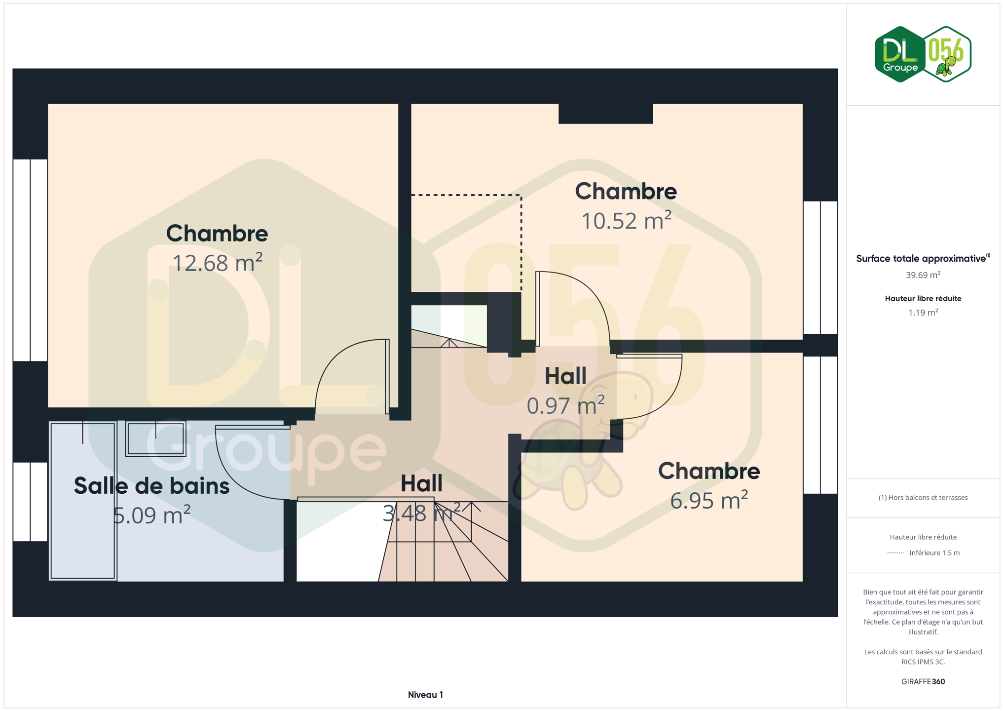 À l’étage, le hall de nuit distribue trois chambres de 13m², 11m² et 7m², ainsi qu’une seconde salle de bains avec baignoire/douche, meuble lavabo et sèche-serviette.