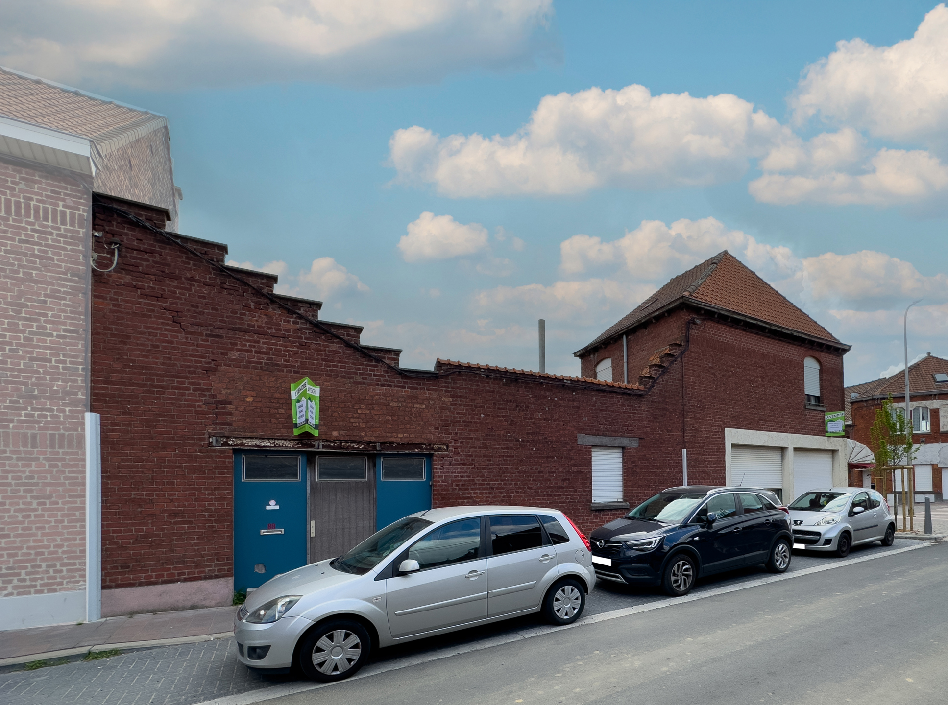 Extérieur : grand garage pour deux voitures, idéal pour un atelier ou un espace de rangement.