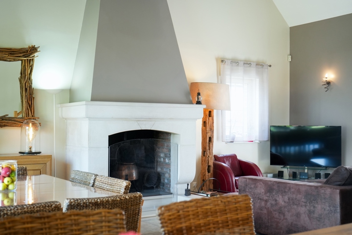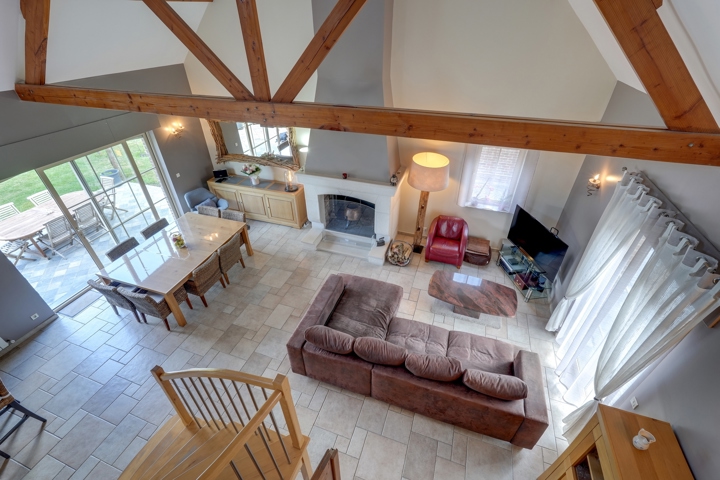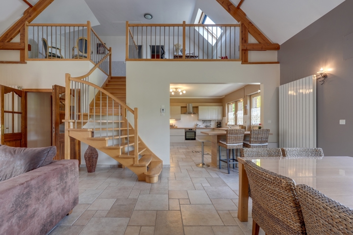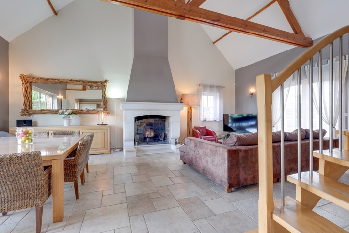 Dès l’entrée, le ton est donné : un spacieux séjour cathédrale sublimé par de majestueuses poutres en bois, une cheminée à feu ouvert et une toute nouvelle cuisine équipée s’unissent pour offrir un espace de vie lumineux, chaleureux et résolument convivial.