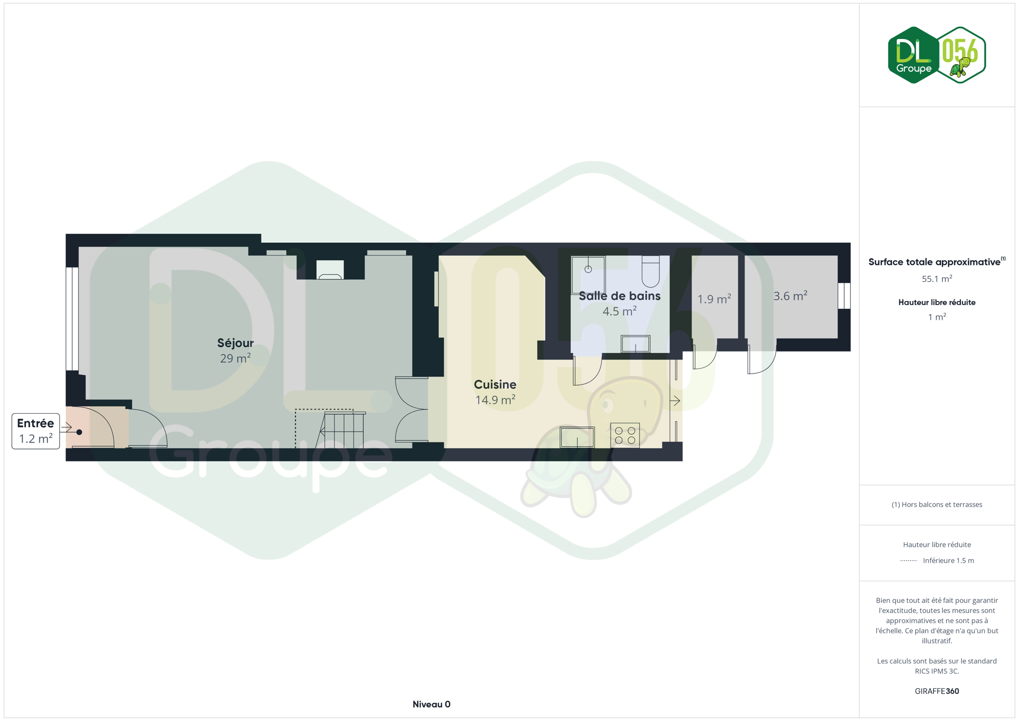 Au REZ : Hall d’entrée desservant un spacieux et lumineux séjour de 32 m² (salon et salle à manger), extension habitable desservant une cuisine semi-équipée de 16m² (plaque de cuisson, hotte, four, évier et rangements) ouverte sur le séjour, une salle de douche faïencée composée d’une douche, d’un lavabo et d’un WC.