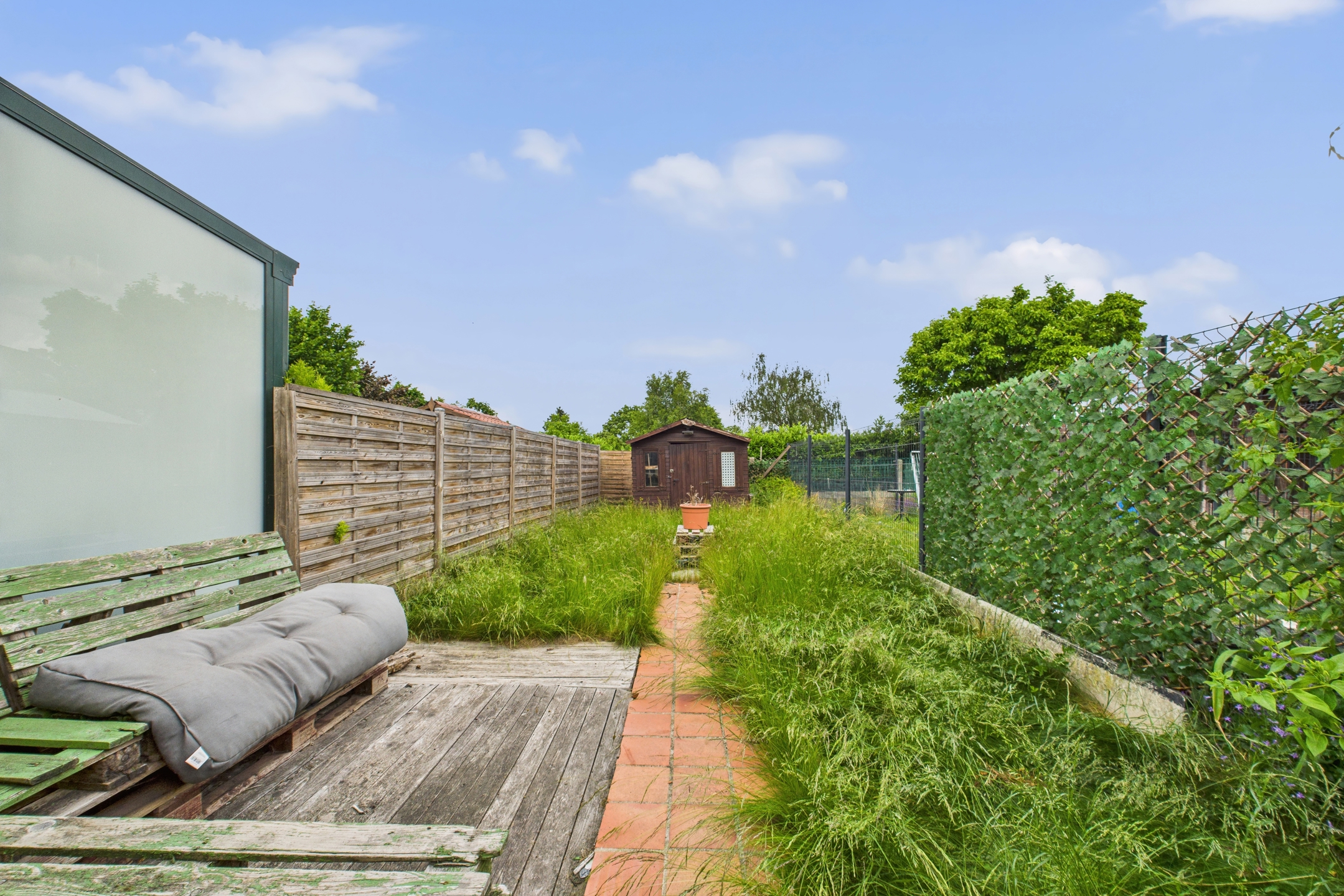 Extérieur : Une terrasse donnant sur un jardin clôturé avec chalet de jardin en fond de parcelle.