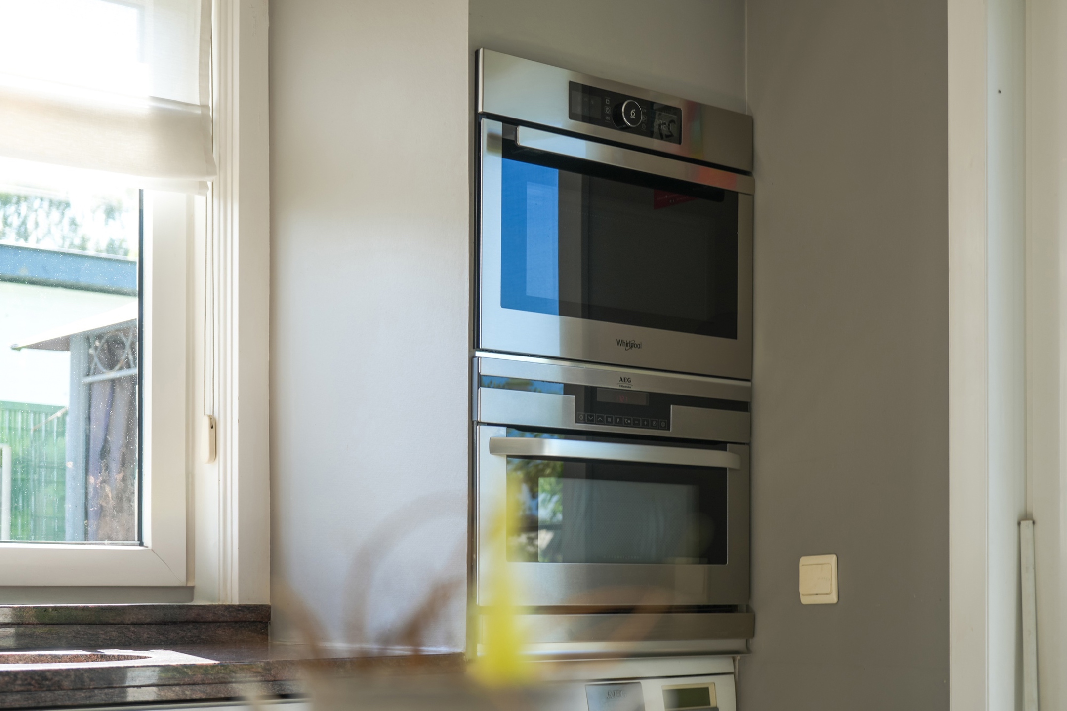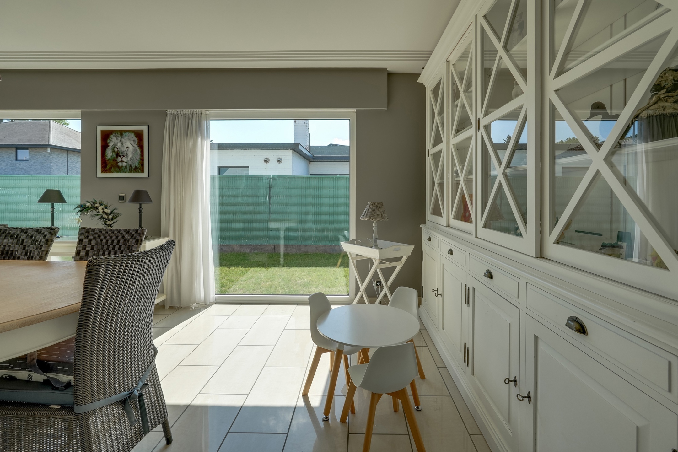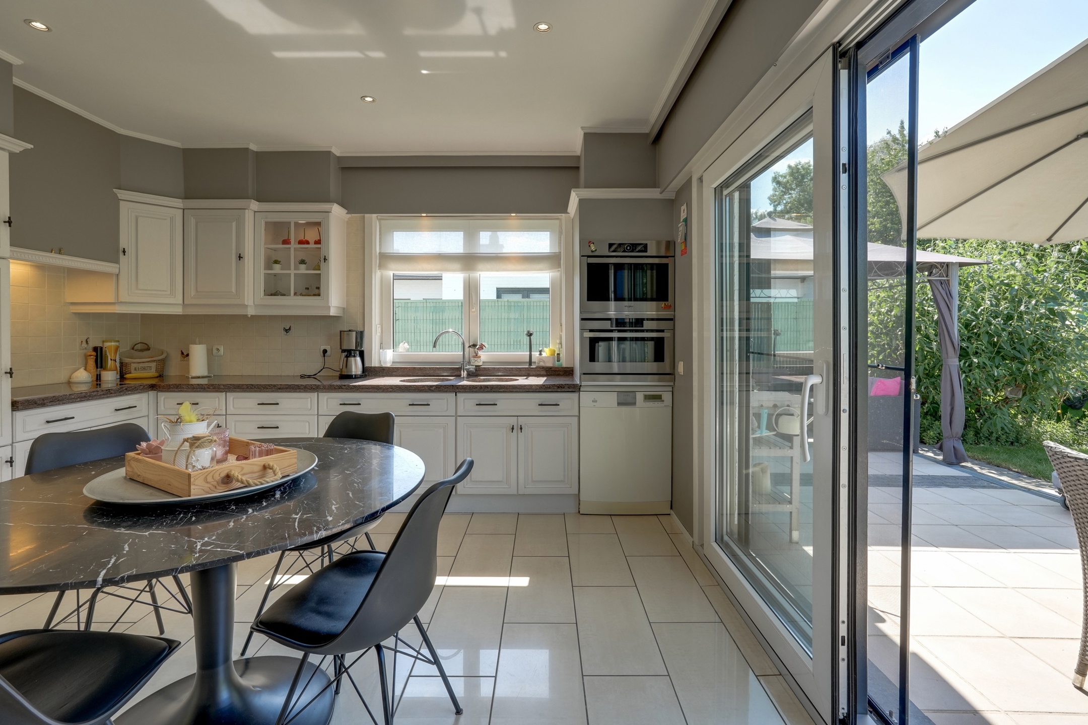 Depuis la cuisine, vous accédez également à un grand garage avec porte automatique, offrant de la place pour deux voitures et du rangement supplémentaire.