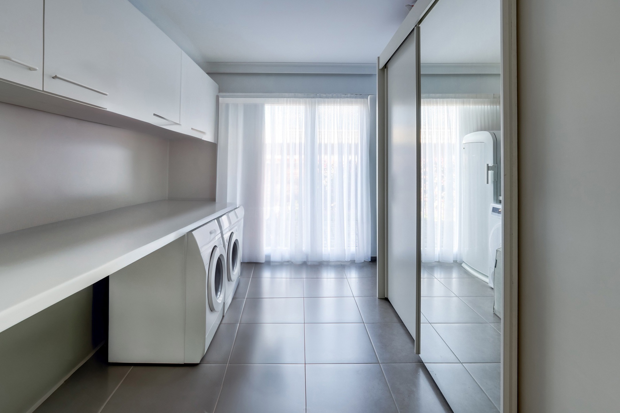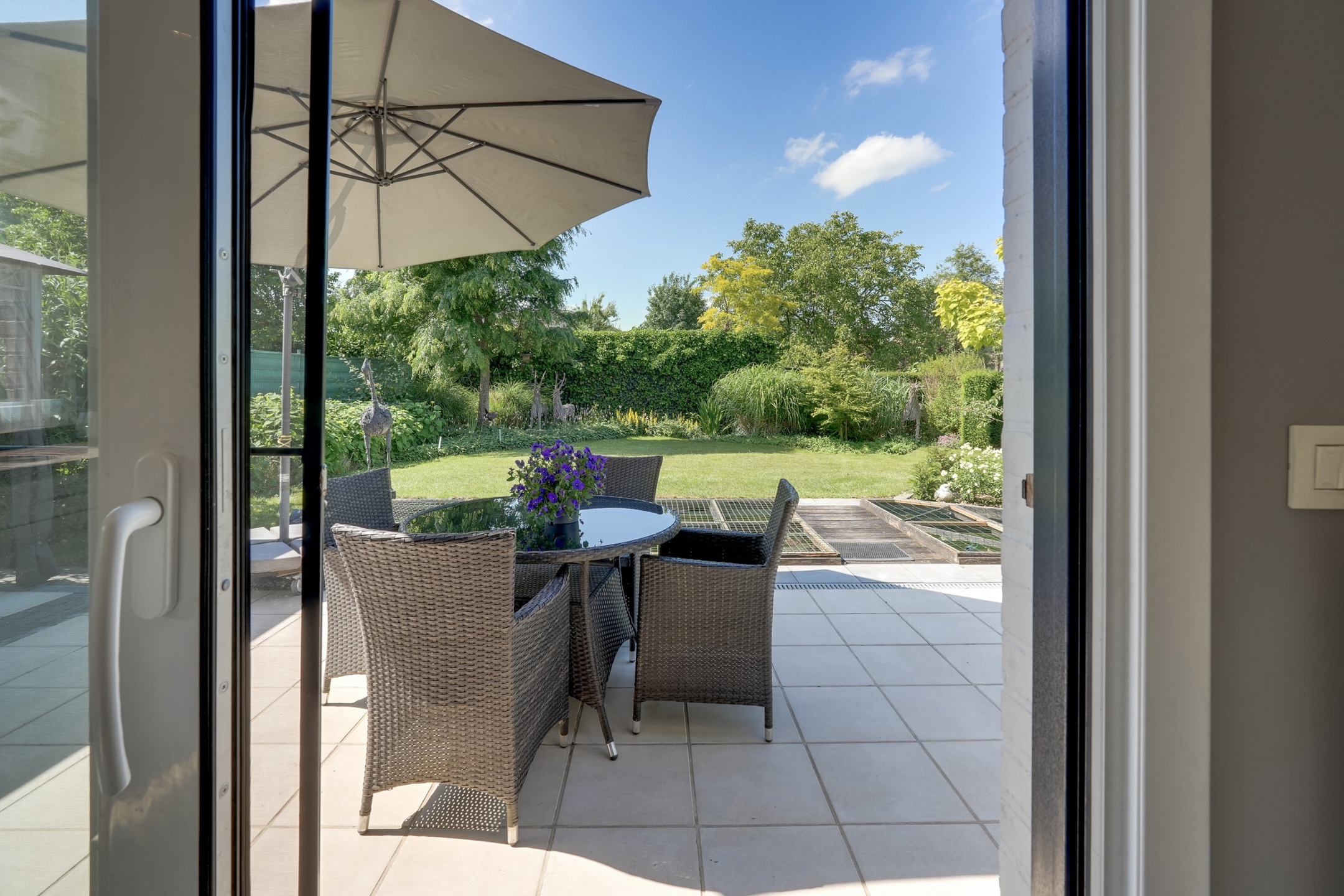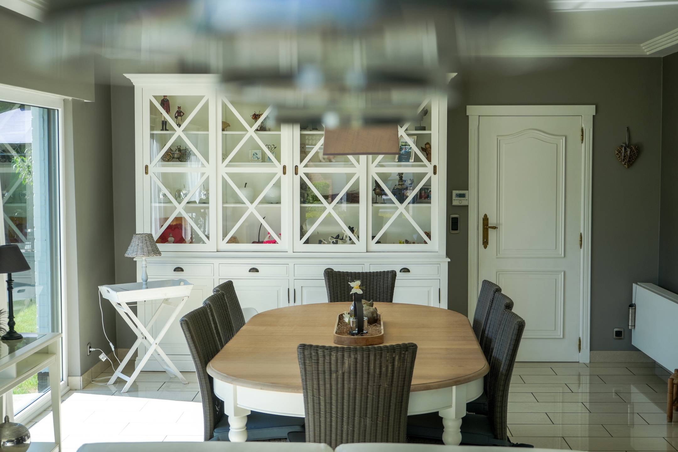Depuis la cuisine, vous accédez également à un grand garage avec porte automatique, offrant de la place pour deux voitures et du rangement supplémentaire.