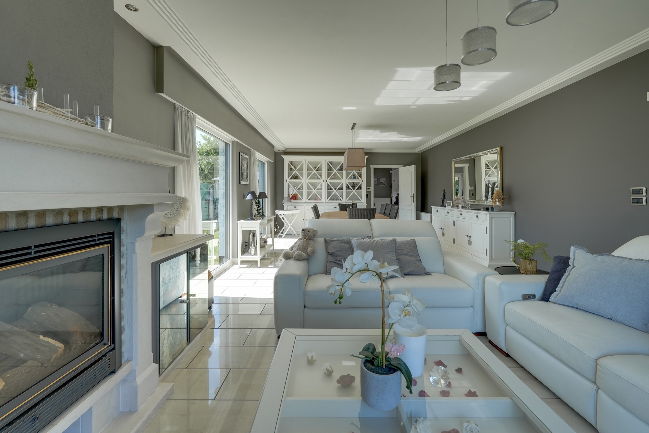 Le séjour lumineux, avec vue sur la rue paisible, dégage une atmosphère conviviale, renforcée par un foyer à gaz moderne. Le chauffage central assure un confort optimal dans toute la maison. La cuisine entièrement équipée, avec un plan de travail en granit et un réfrigérateur encastré, donne un accès direct à la terrasse et au magnifique jardin paysager d’environ 500 m². Cet espace extérieur offre une intimité totale et comprend une agréable terrasse, un étang décoratif et un havre de verdure propice à la détente.