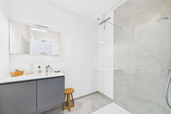 Le hall de nuit dessert deux chambres de 10 m² et 8 m², chacune avec placards intégrés, une salle de bains avec douche à l`italienne, meuble lavabo et VMC, ainsi qu’un WC séparé suspendu.