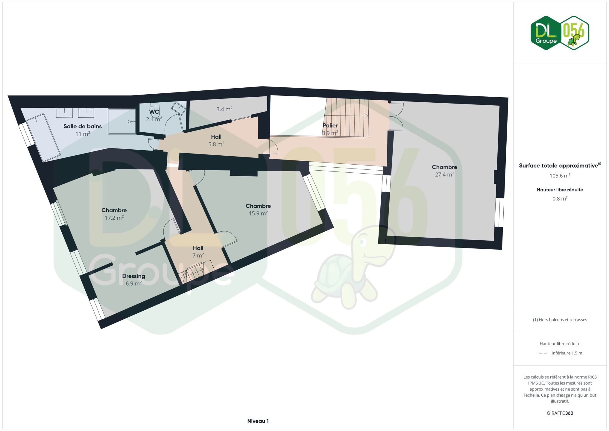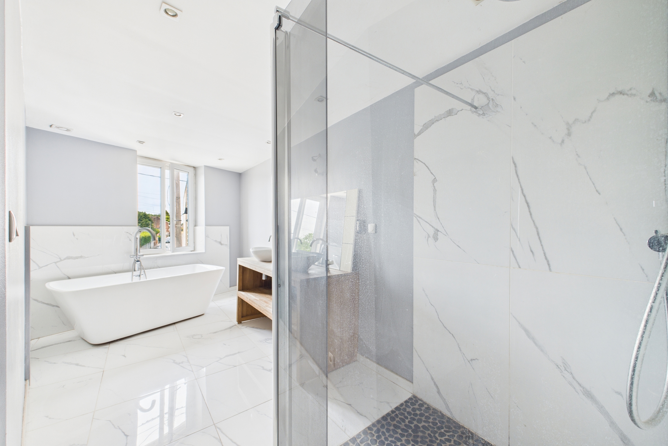 Au 1er étage : Hall de nuit desservant 3 chambres à coucher (dont une à parachever et une avec un espace dressing), une salle de bains composée d’une baignoire ilot, d’une douche à l’italienne, d’un meuble lavabo double vasque, un WC suspendu séparé avec lave-mains, une buanderie.