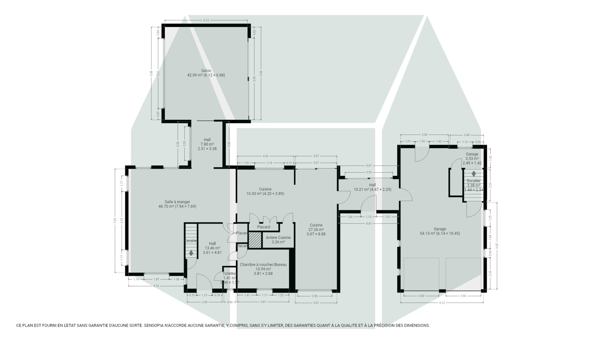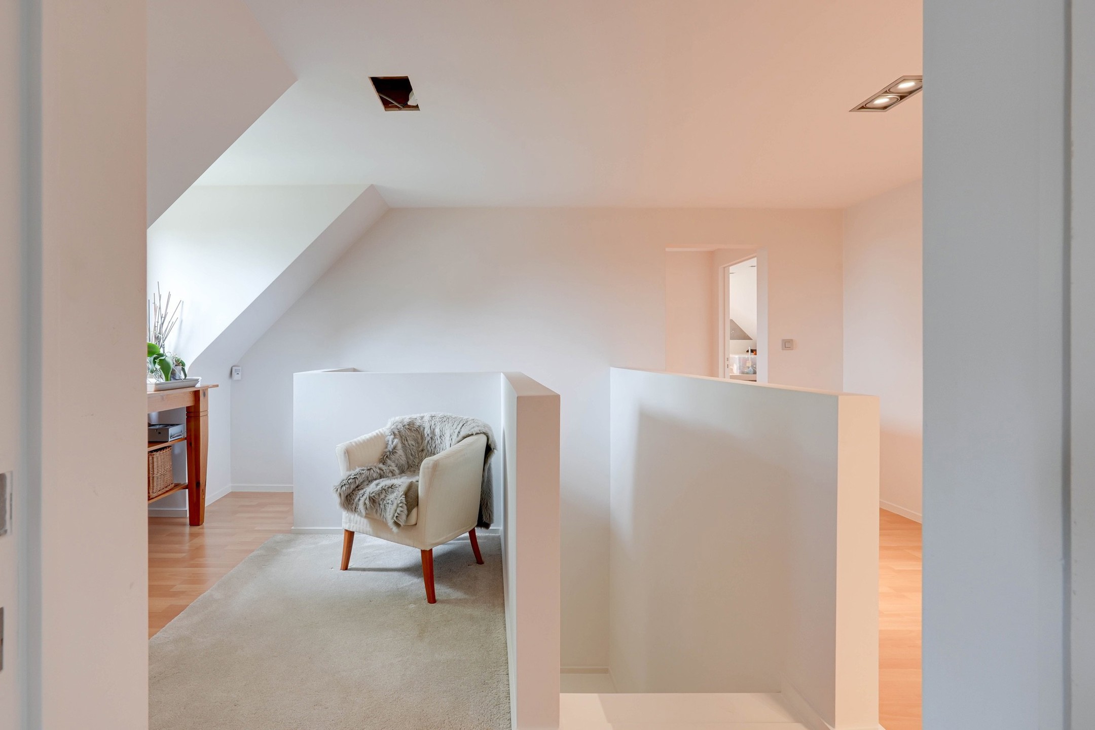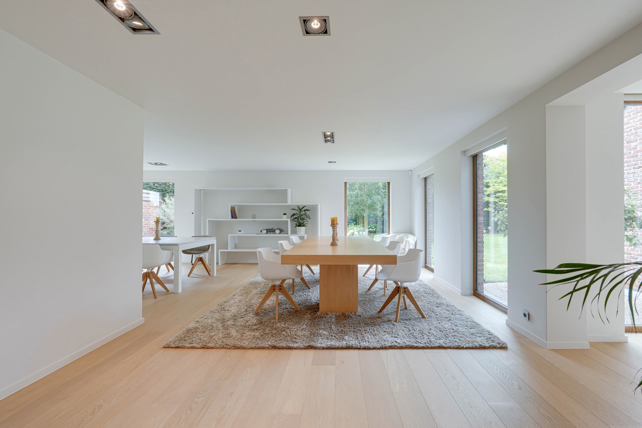 Au rez-de-chaussée, un hall d`entrée épuré mène à une salle à manger de 46m², un salon séparé de 42m² avec insert au gaz, et une cuisine équipée de 43m². Vous y trouverez également un bureau indépendant et un spacieux garage de 54m² avec accès à une grande cave.