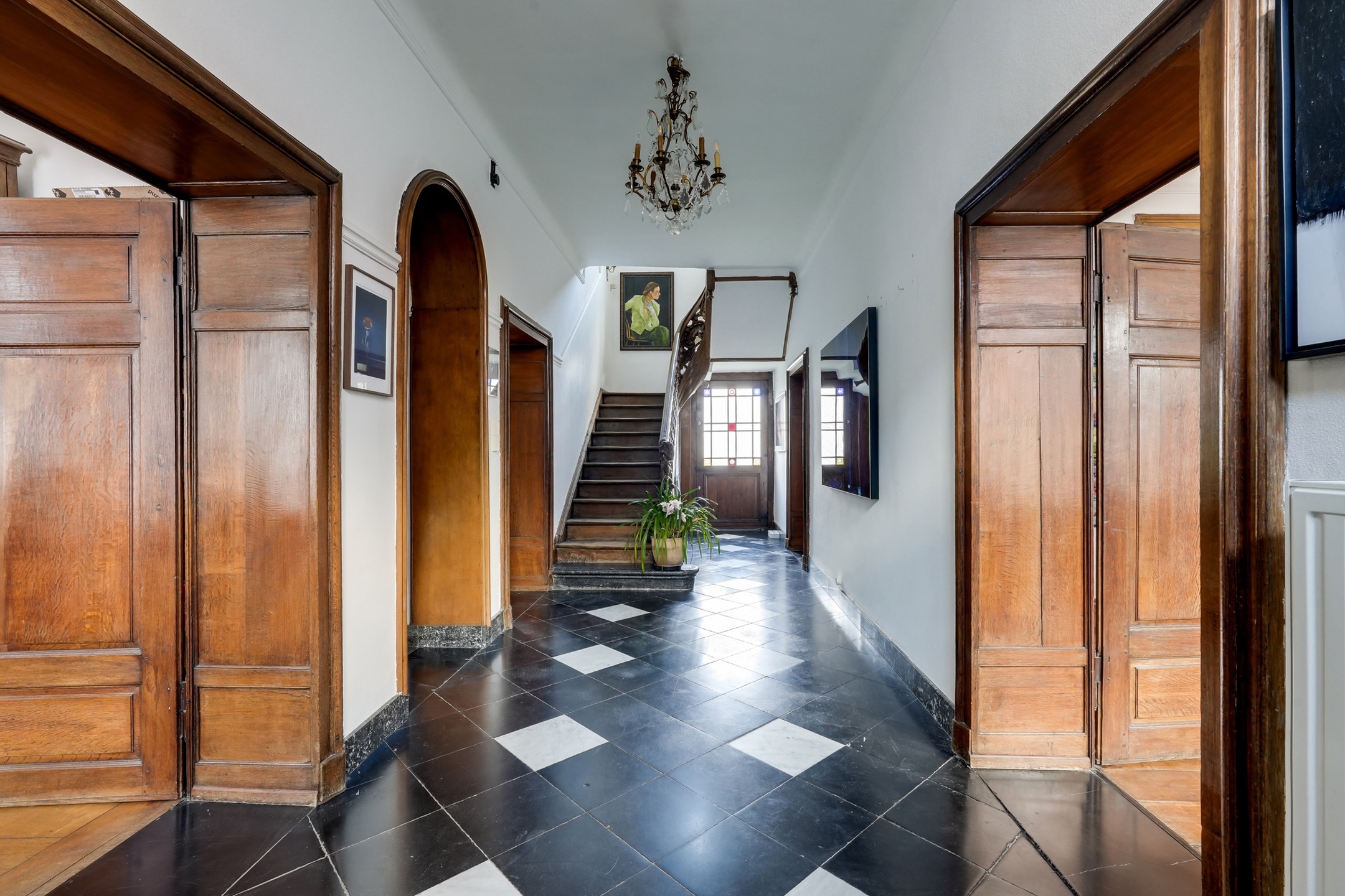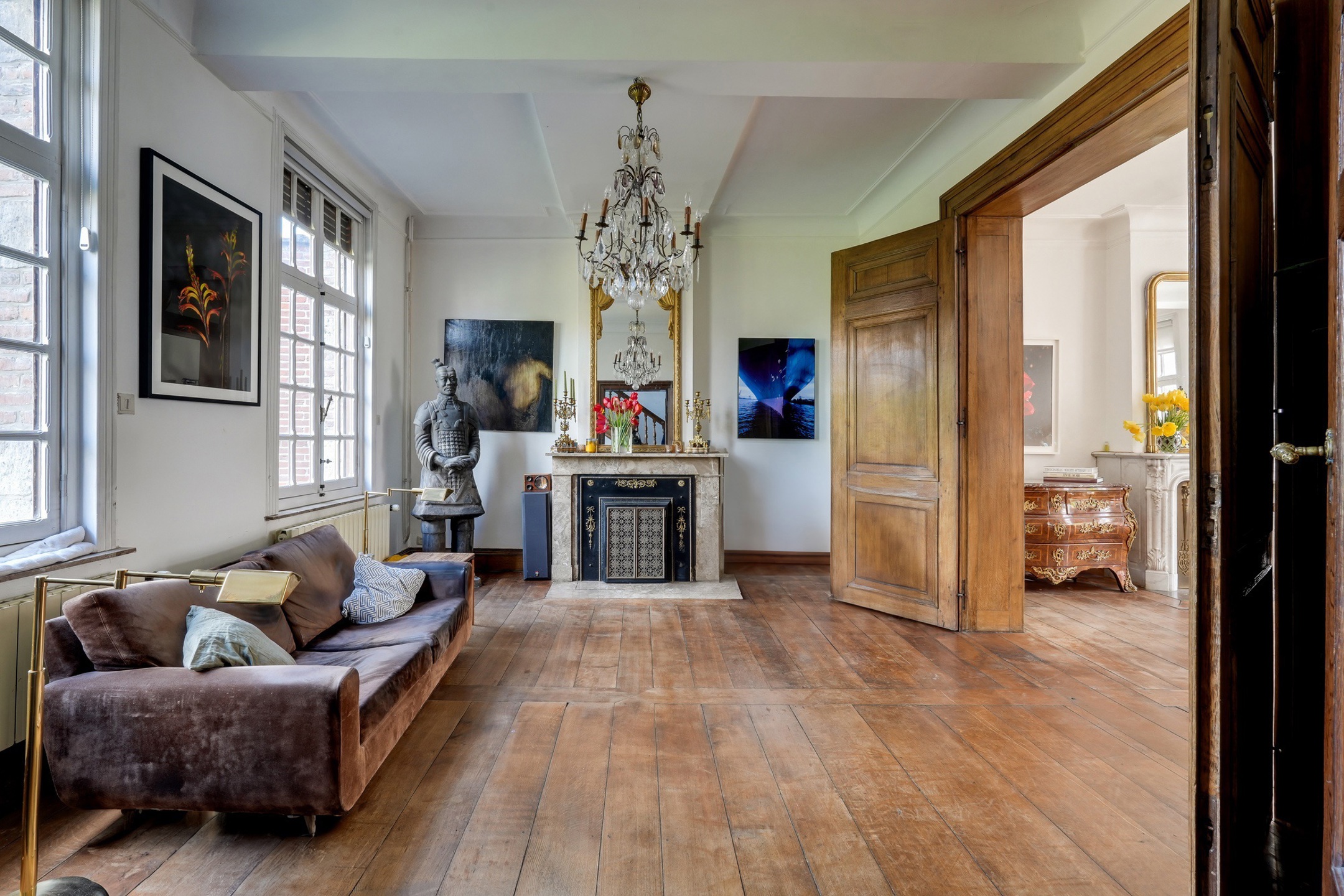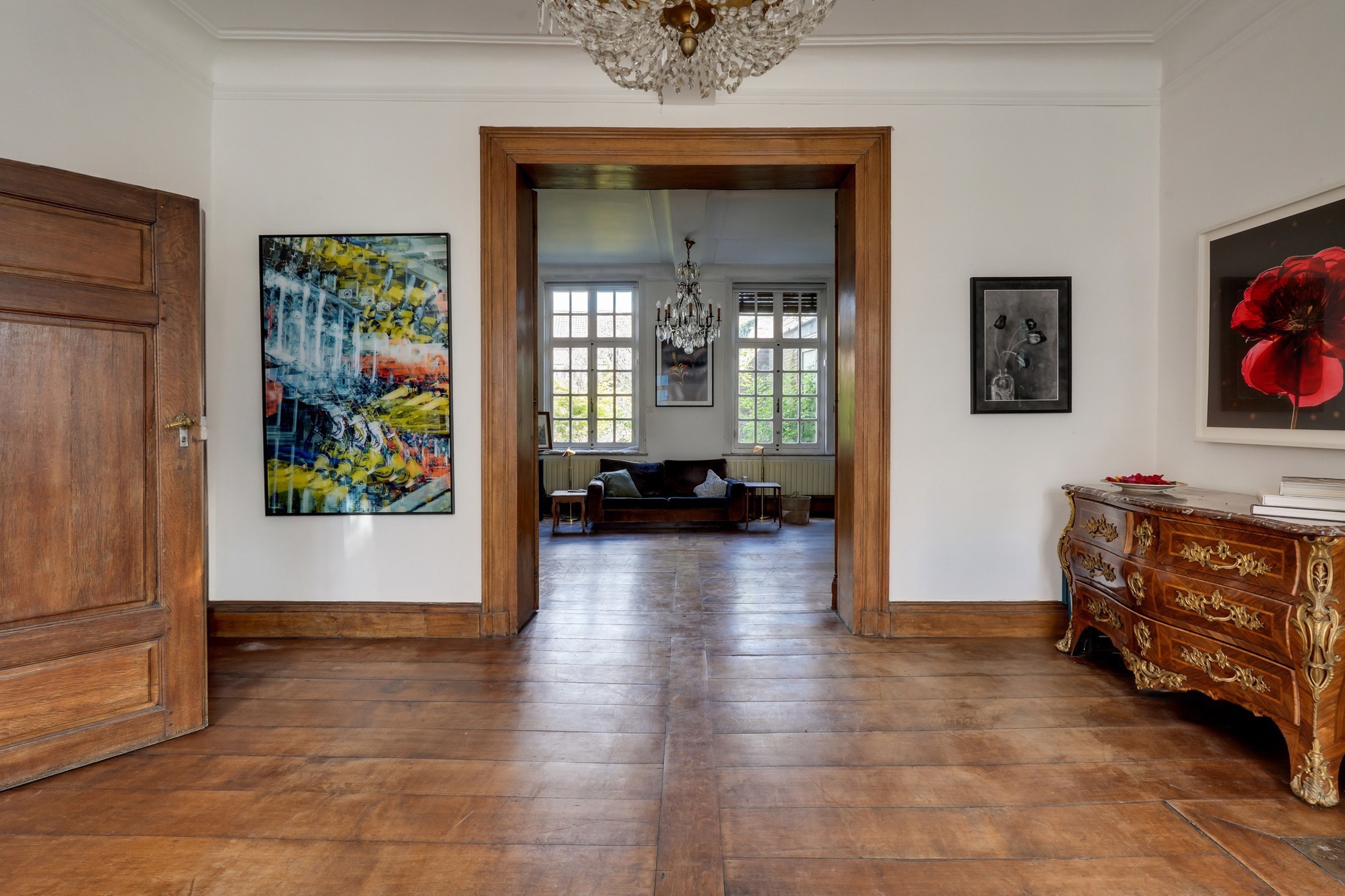 Le rez-de-chaussée s’ouvre sur un majestueux hall d’entrée qui dessert les pièces principales : deux salons raffinés ornés de magnifiques planchers anciens, une salle à manger élégante, chacun agrémenté d`une cheminée en marbre authentique. La cuisine équipée, fonctionnelle et lumineuse, donne un accès direct à la terrasse. Vous trouverez également une buanderie pratique ainsi qu’un bureau, idéal pour le télétravail.