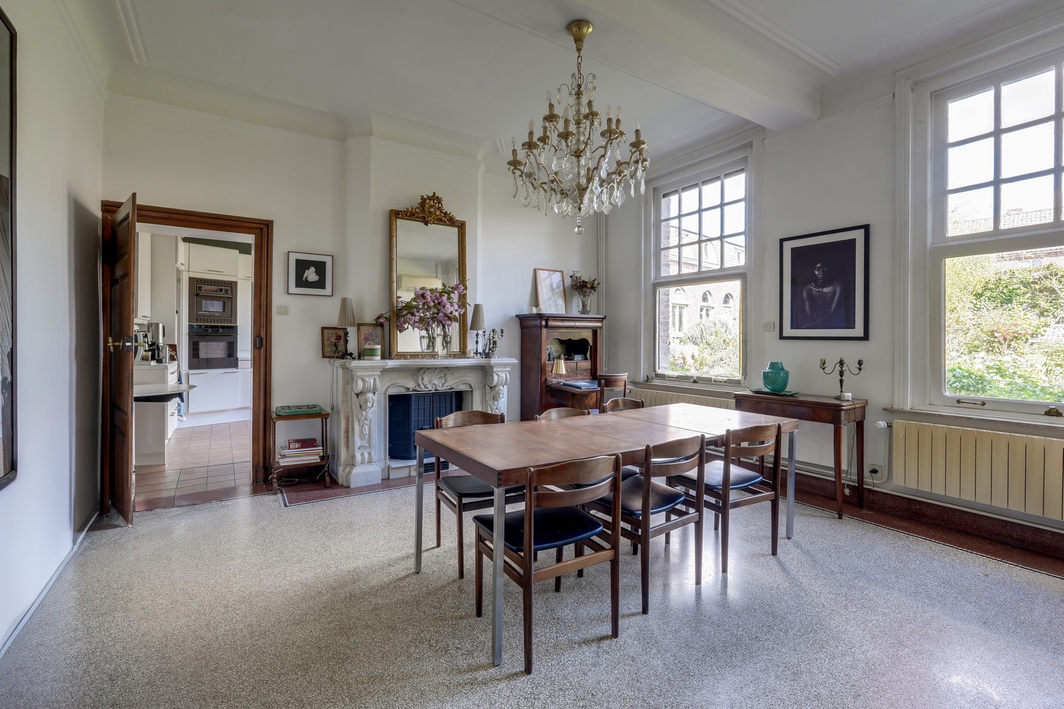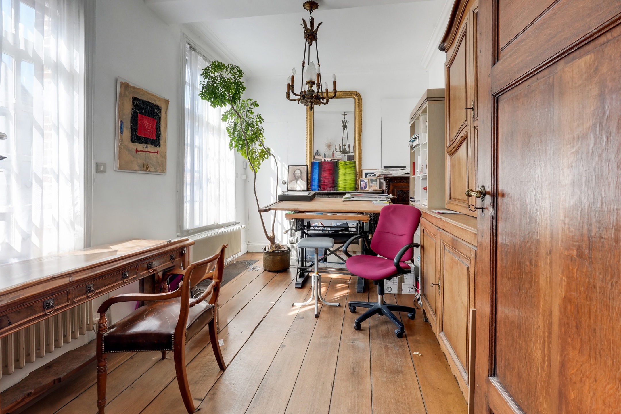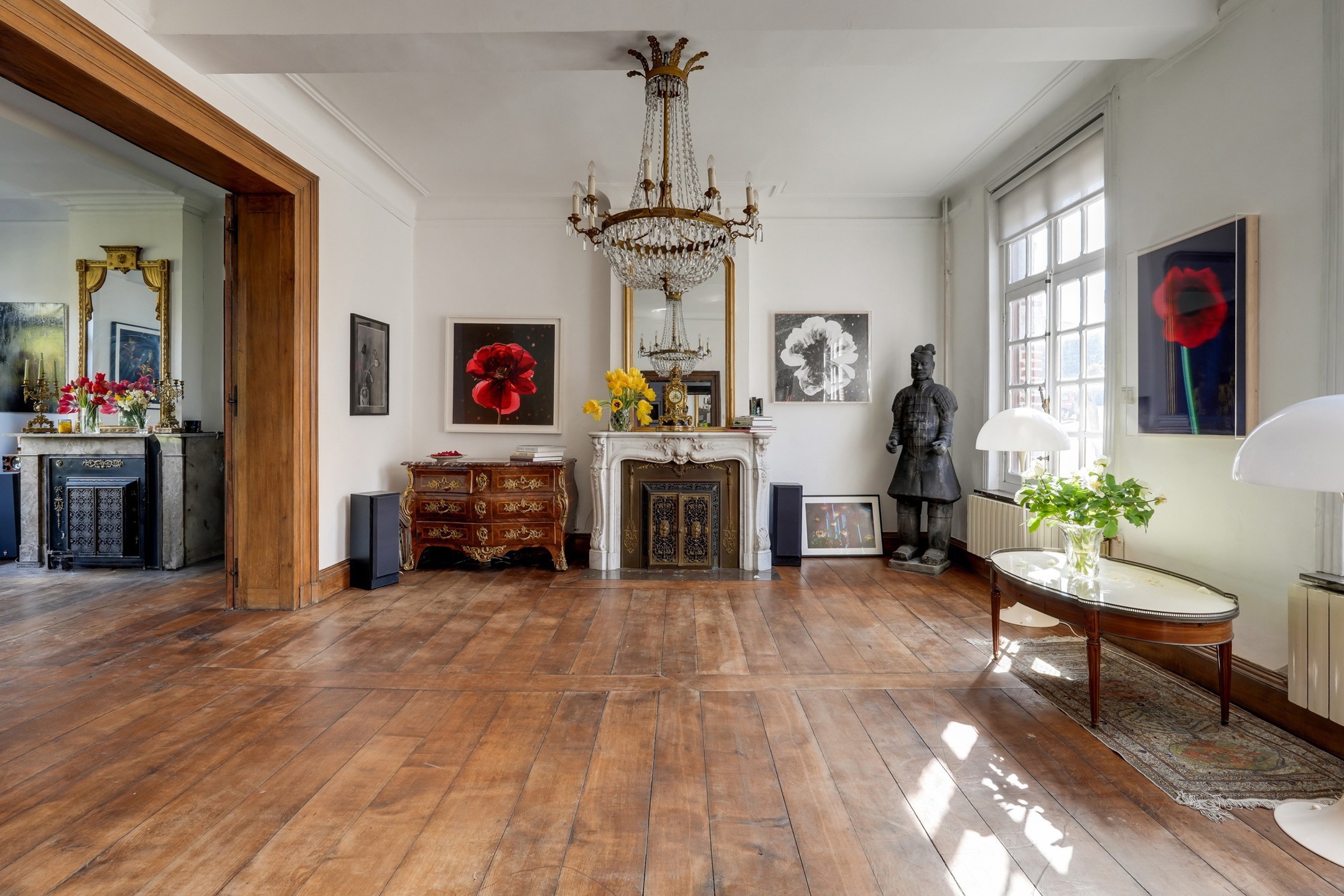 Le rez-de-chaussée s’ouvre sur un majestueux hall d’entrée qui dessert les pièces principales : deux salons raffinés ornés de magnifiques planchers anciens, une salle à manger élégante, chacun agrémenté d`une cheminée en marbre authentique. La cuisine équipée, fonctionnelle et lumineuse, donne un accès direct à la terrasse. Vous trouverez également une buanderie pratique ainsi qu’un bureau, idéal pour le télétravail.