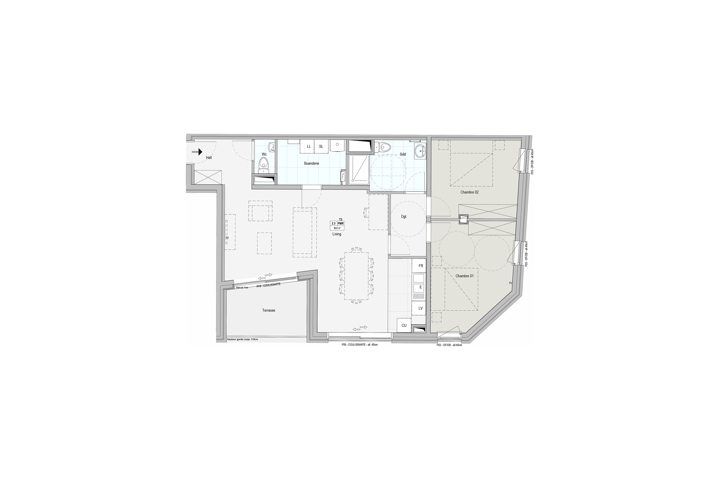 - Agencement : Hall, séjour avec cuisine ouverte, buanderie, 1 WC séparé avec lave-mains, 2 chambres, salle de douche avec meuble vasque et douche 120 x 90 cm, ascenseur