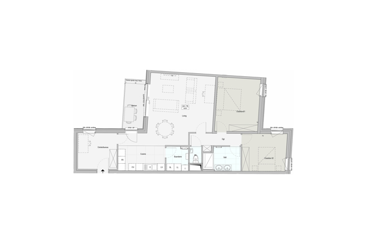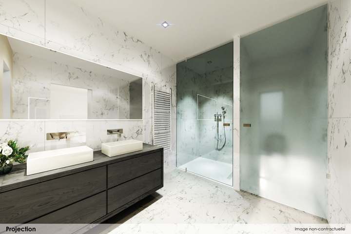- Agencement : Hall, séjour avec cuisine ouverte, buanderie, 1 WC séparé avec lave-mains, 2 chambres, salle de douche avec meuble double-vasque et douche 120 x 90 cm, ascenseur