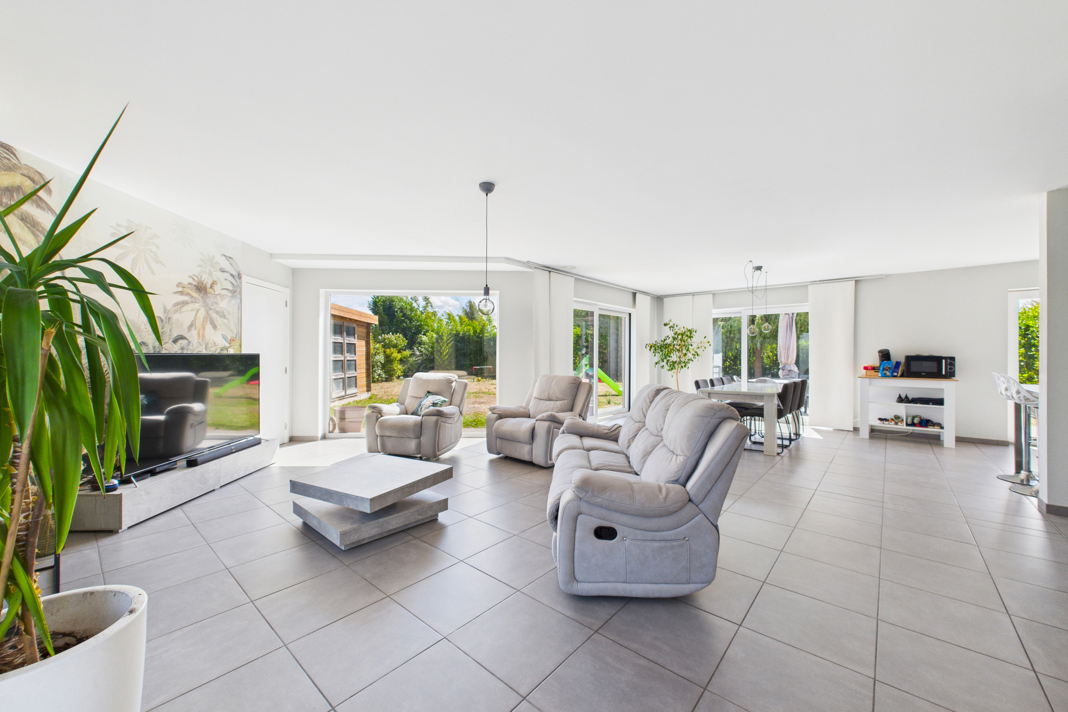 Au REZ: Hall d’entrée avec espace vestiaire, WC avec lave-mains, séjour traversant de ± 44 m² combinant salon et salle à manger, cuisine équipée (taque vitrocéramique, four, évier, hotte, lave-vaisselle), buanderie/réserve, garage une voiture avec porte sectionnelle motorisée donnant également accès directement au jardin, grenier de rangement au-dessus.