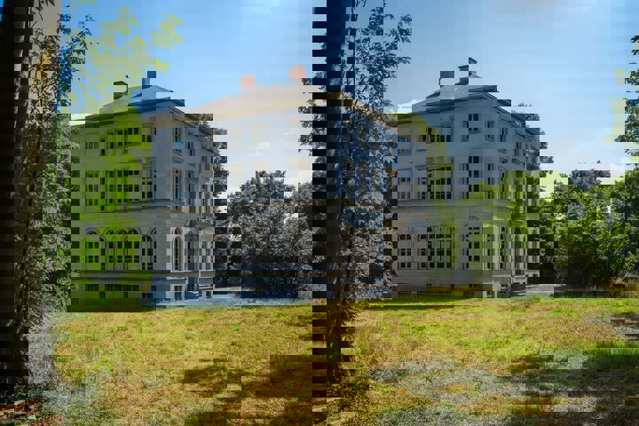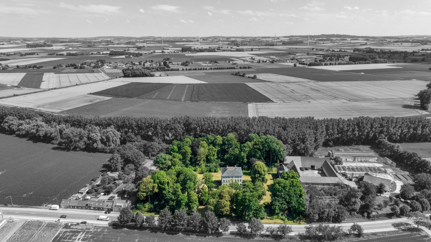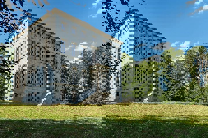 Datant d’environ 1840, le château est un parfait exemple d’architecture néoclassique, rehaussé de touches empire. Ses façades monumentales, ses volumes symétriques et ses détails raffinés dégagent une élégance intemporelle. L’intérieur se compose de quatre niveaux, dont une cave, un rez-de-chaussée et un premier étage avec chacun cinq pièces spacieuses, un couloir central et un espace prévu pour un ascenseur. Le deuxième étage abrite un vaste espace ouvert de 205 m² et une superbe terrasse de toit de 36 m² offrant une vue panoramique sur le paysage environnant.