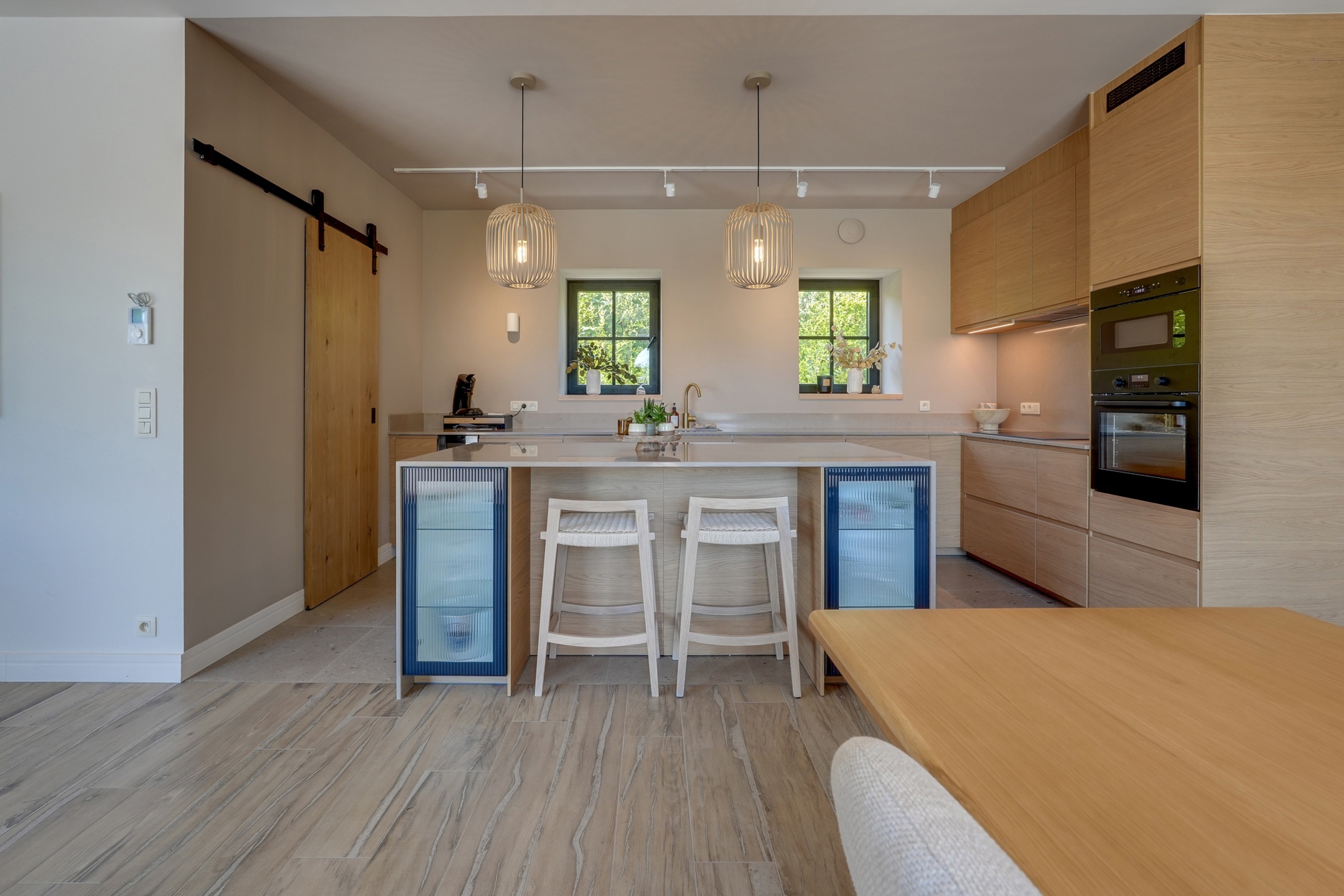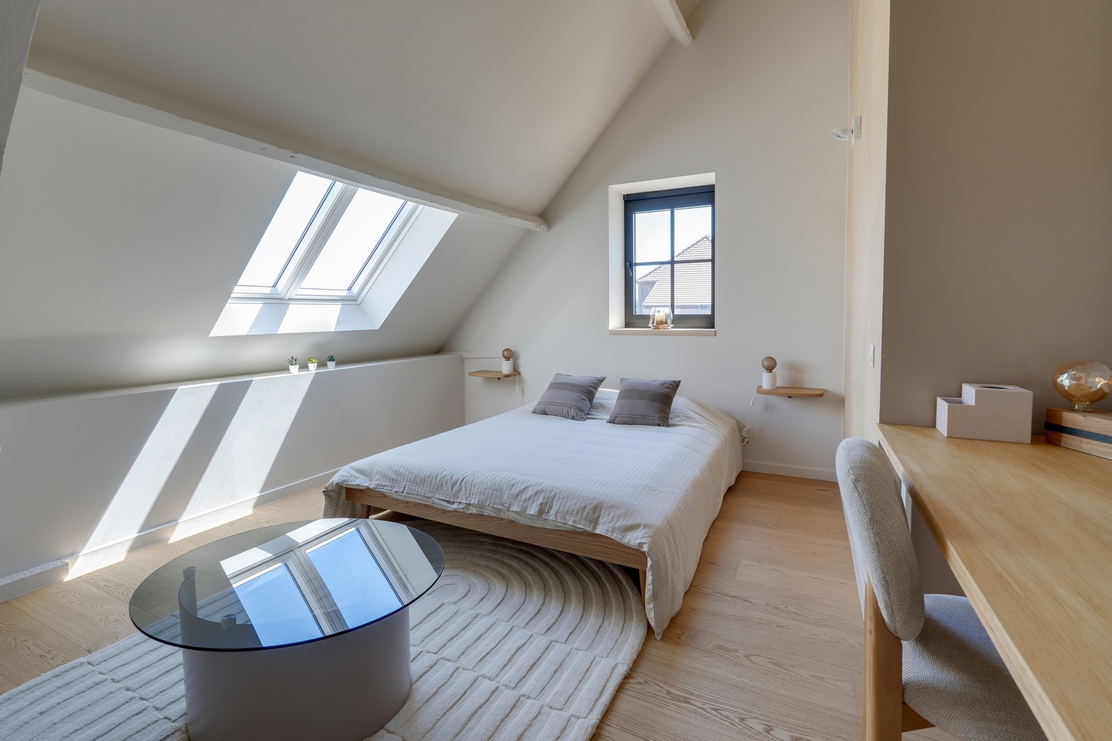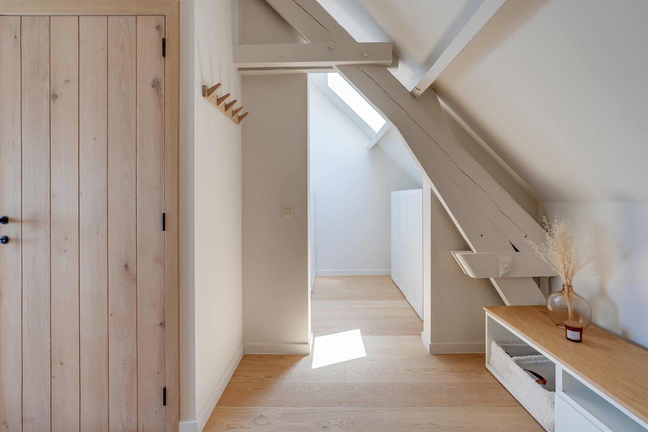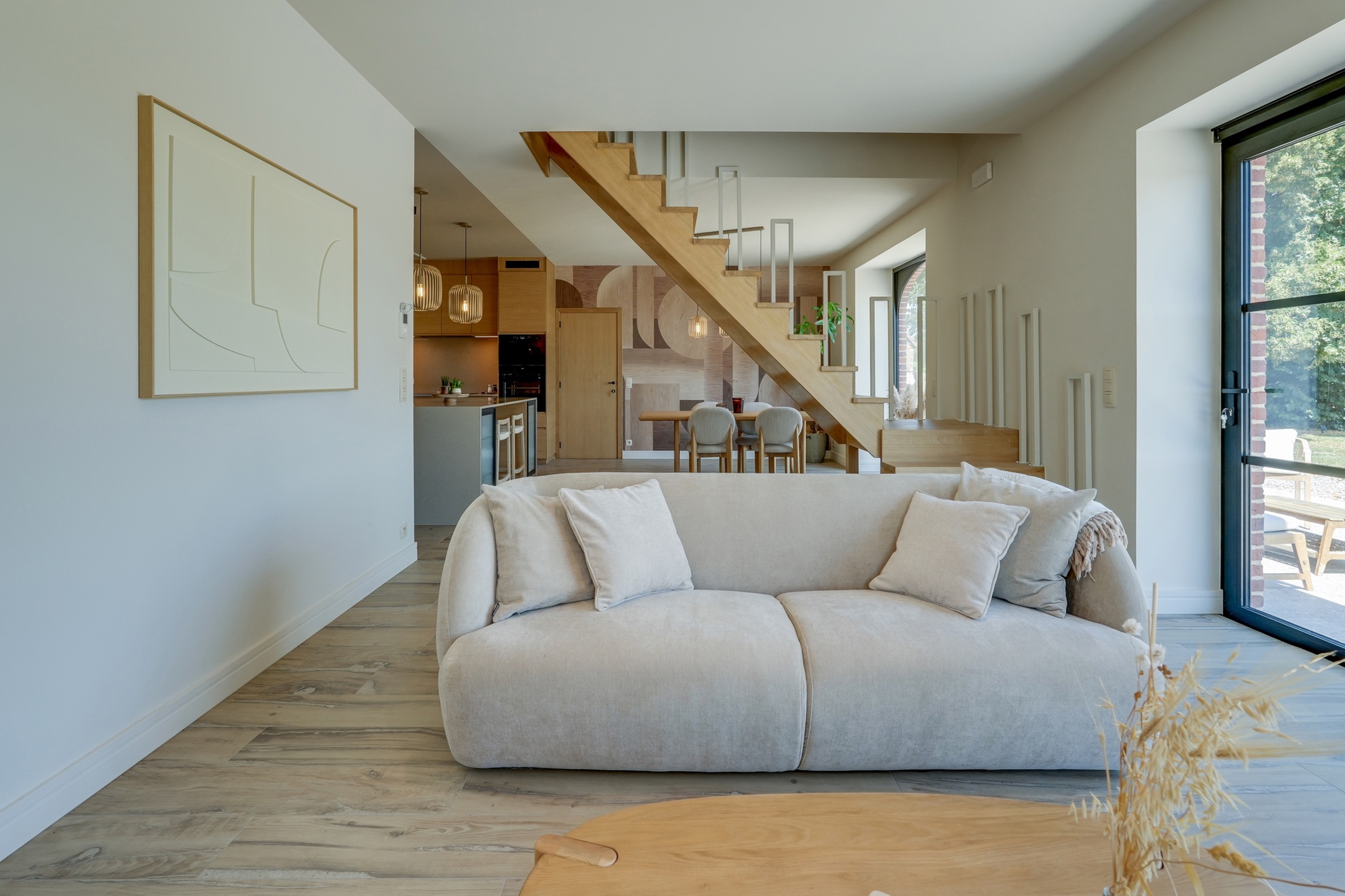 La première partie (175 m²) est entièrement rénovée et aménagée : deux suites de 20 m², une grande salle de bain et une salle de douche XL, une cuisine full équipée, une buanderie, deux WC séparés, un vaste hall d’entrée.