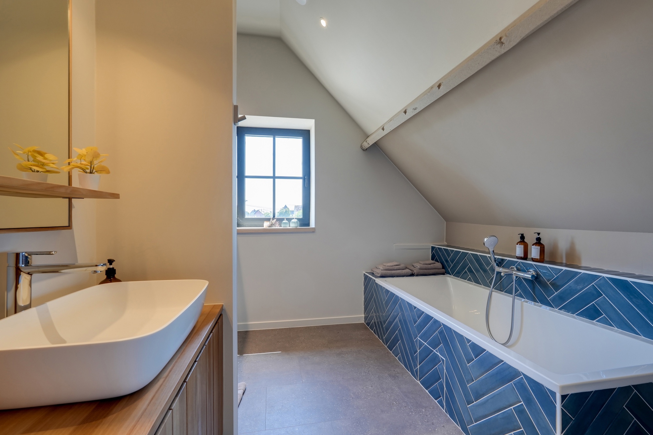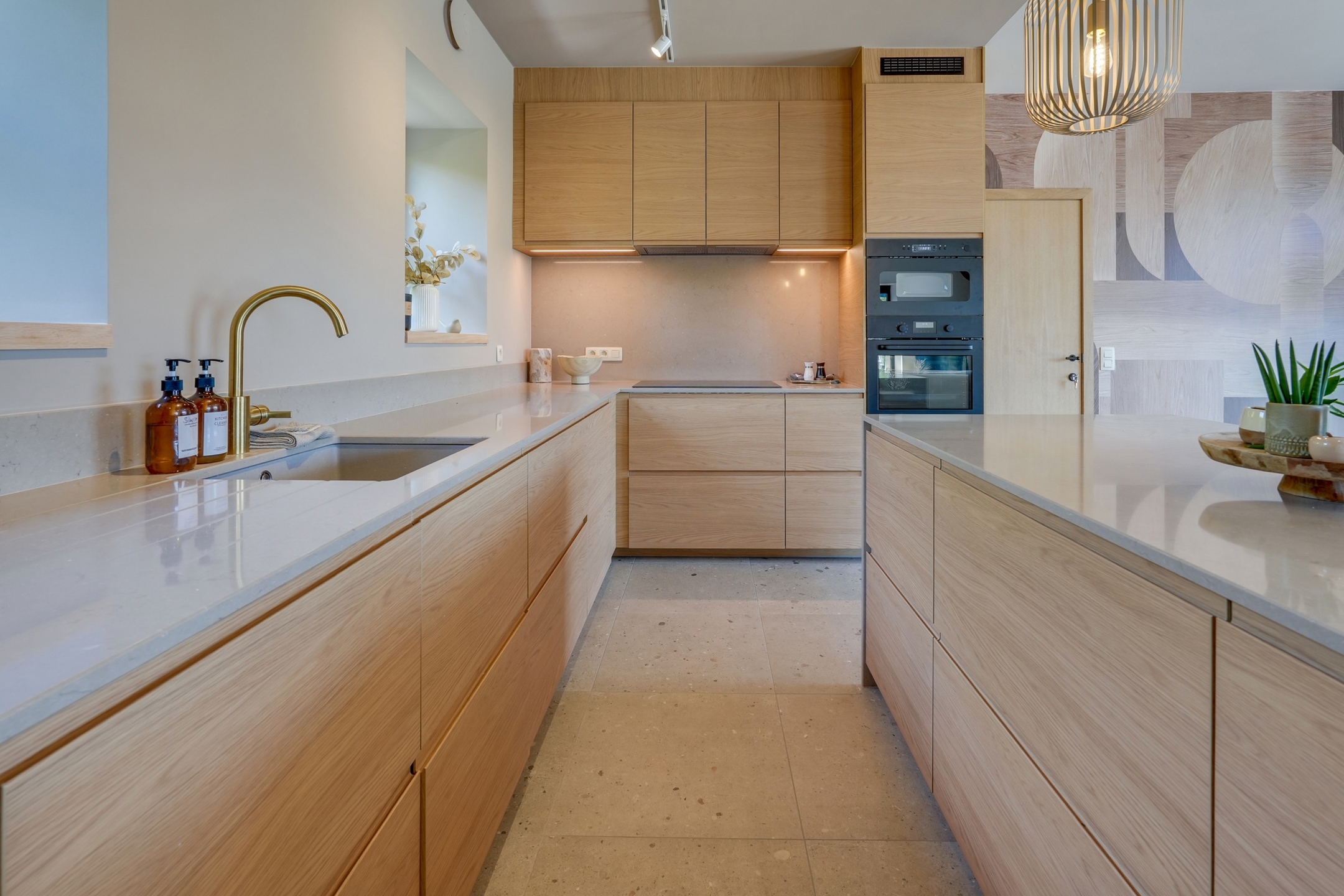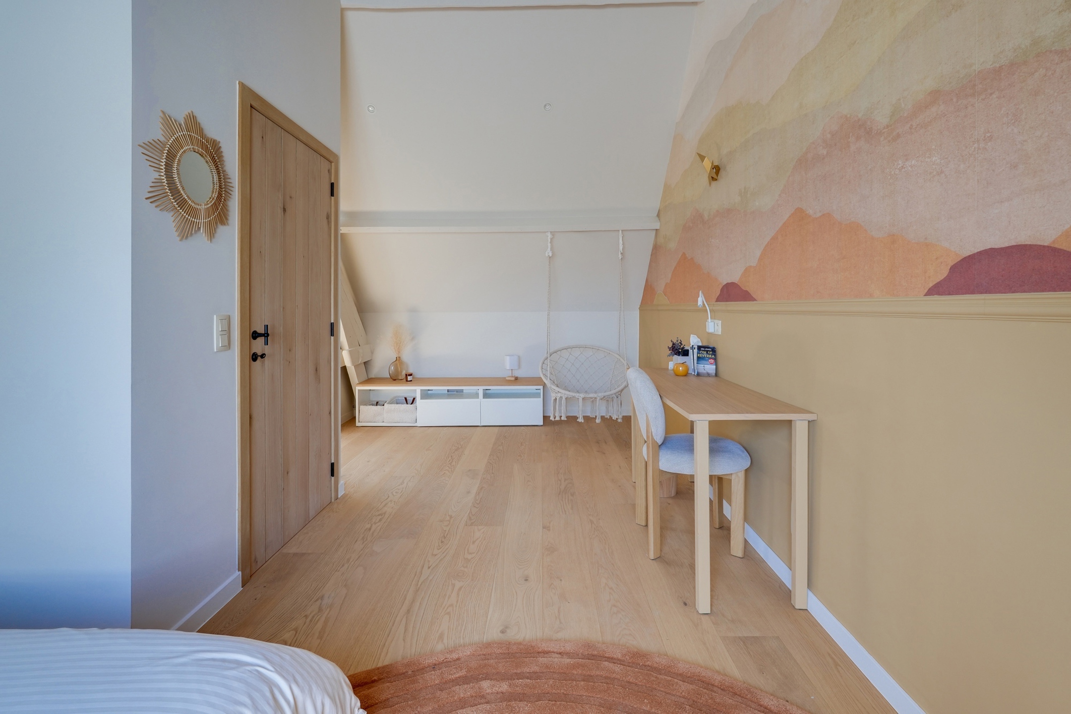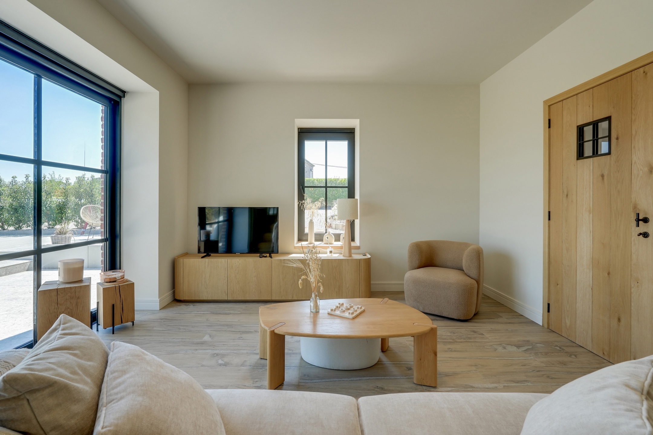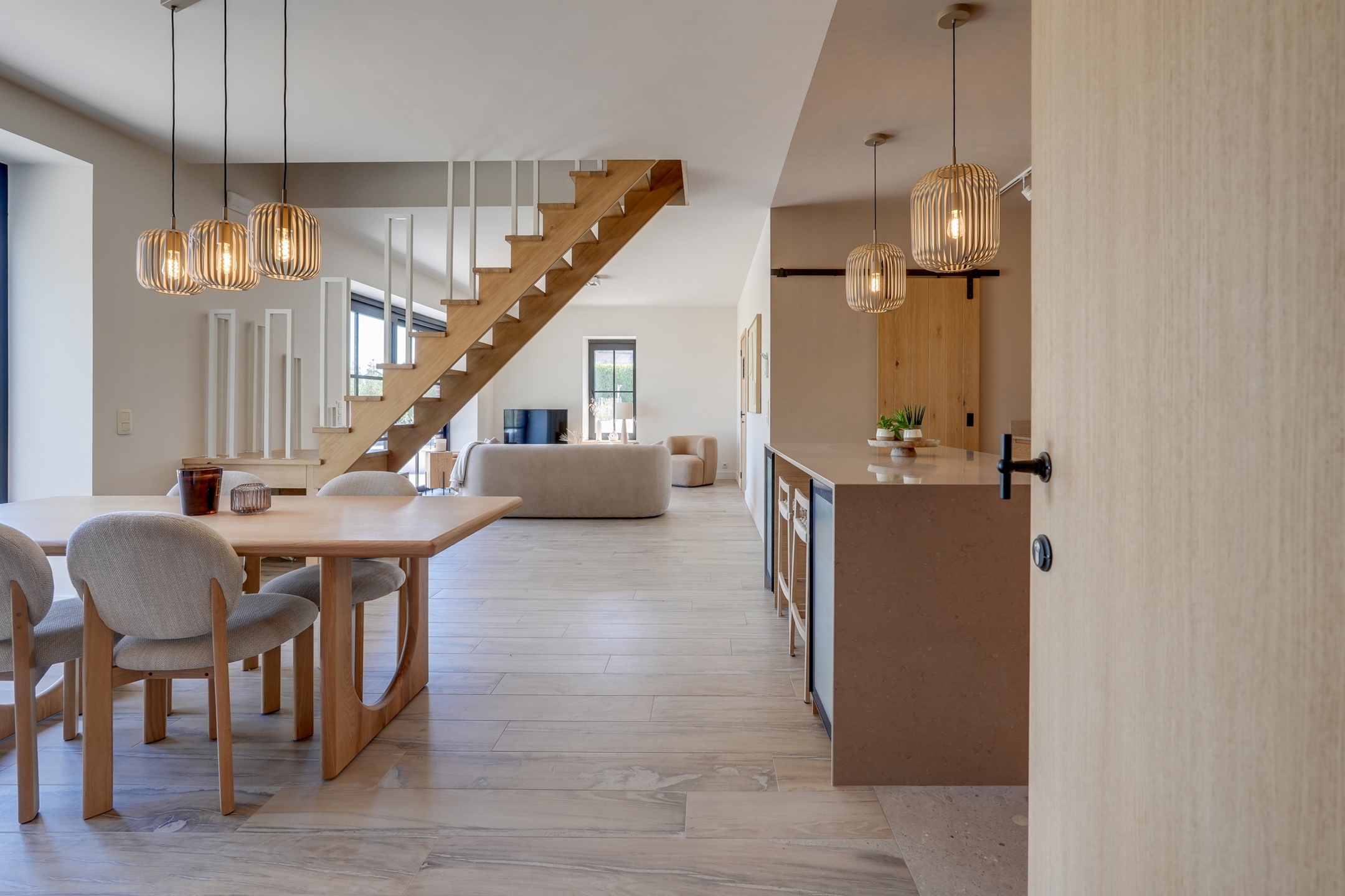 La première partie (175 m²) est entièrement rénovée et aménagée : deux suites de 20 m², une grande salle de bain et une salle de douche XL, une cuisine full équipée, une buanderie, deux WC séparés, un vaste hall d’entrée.