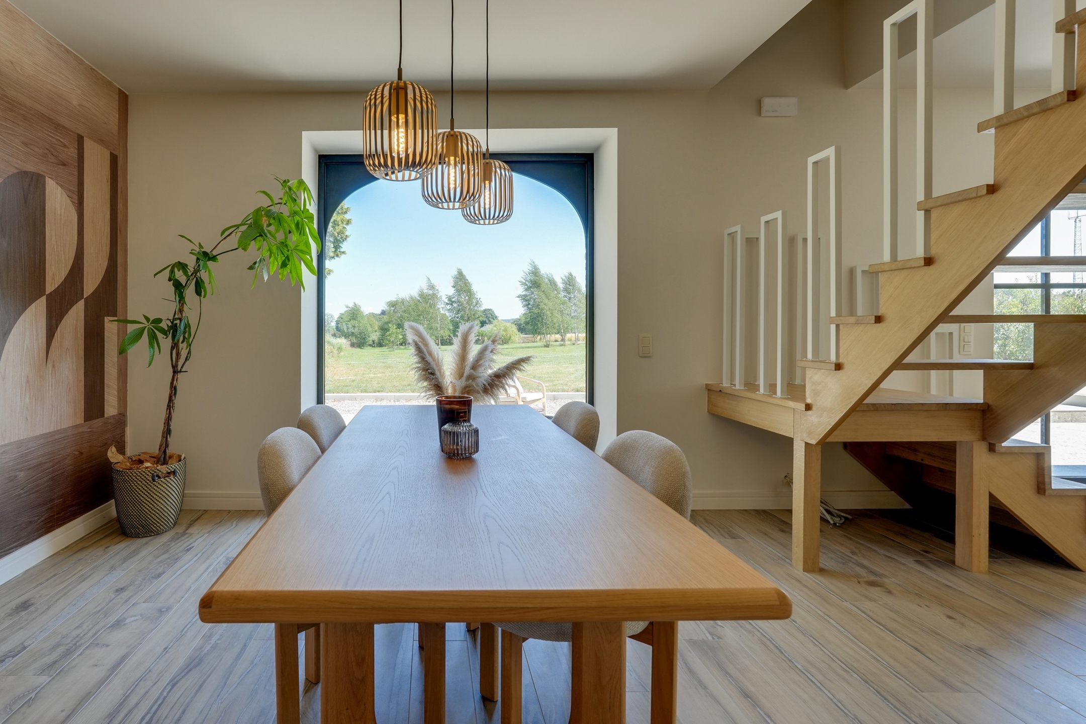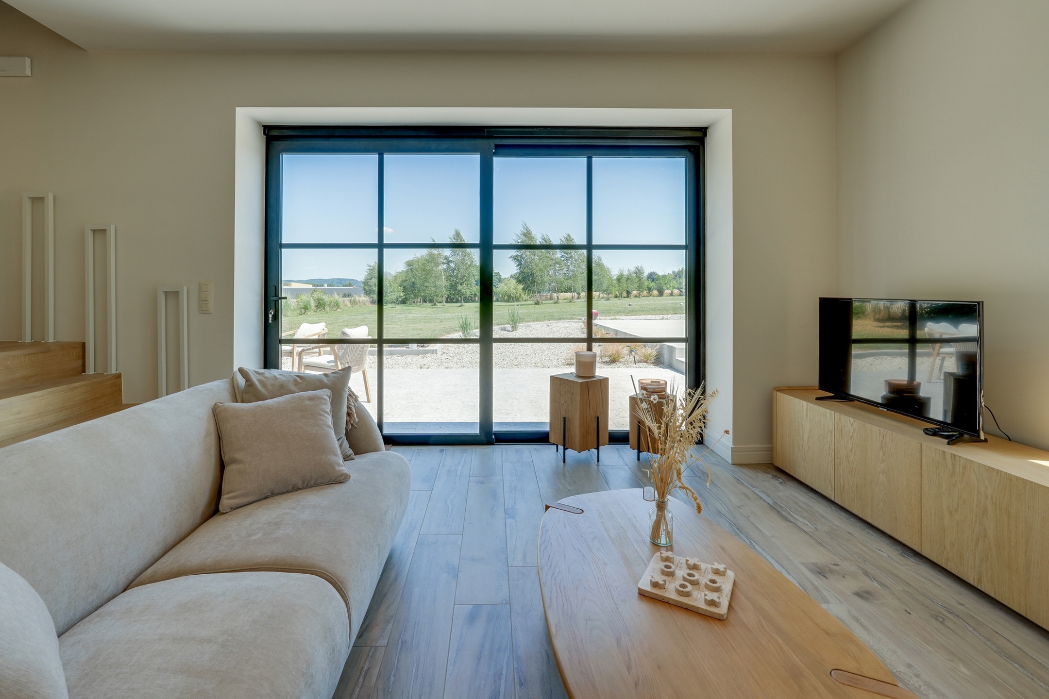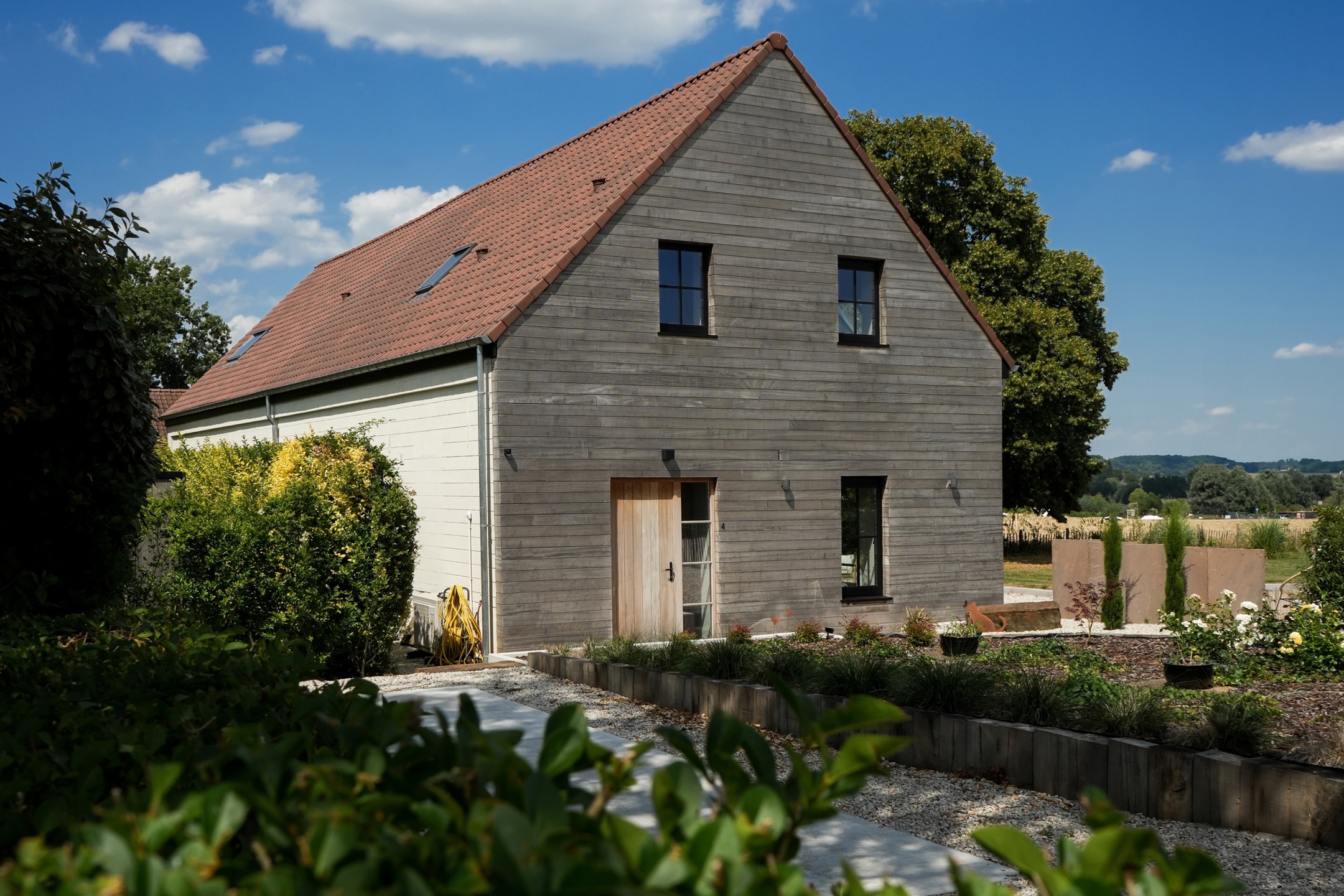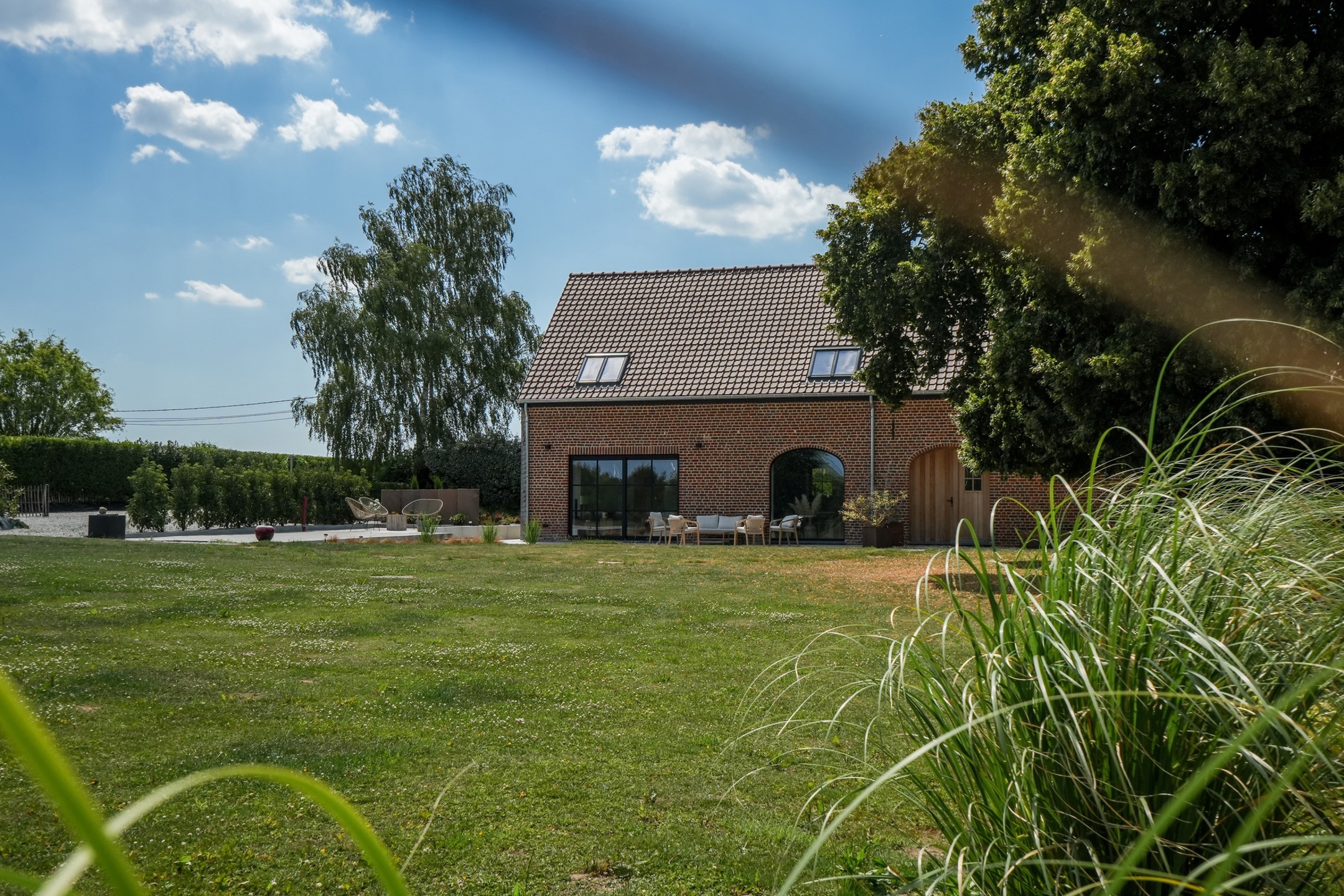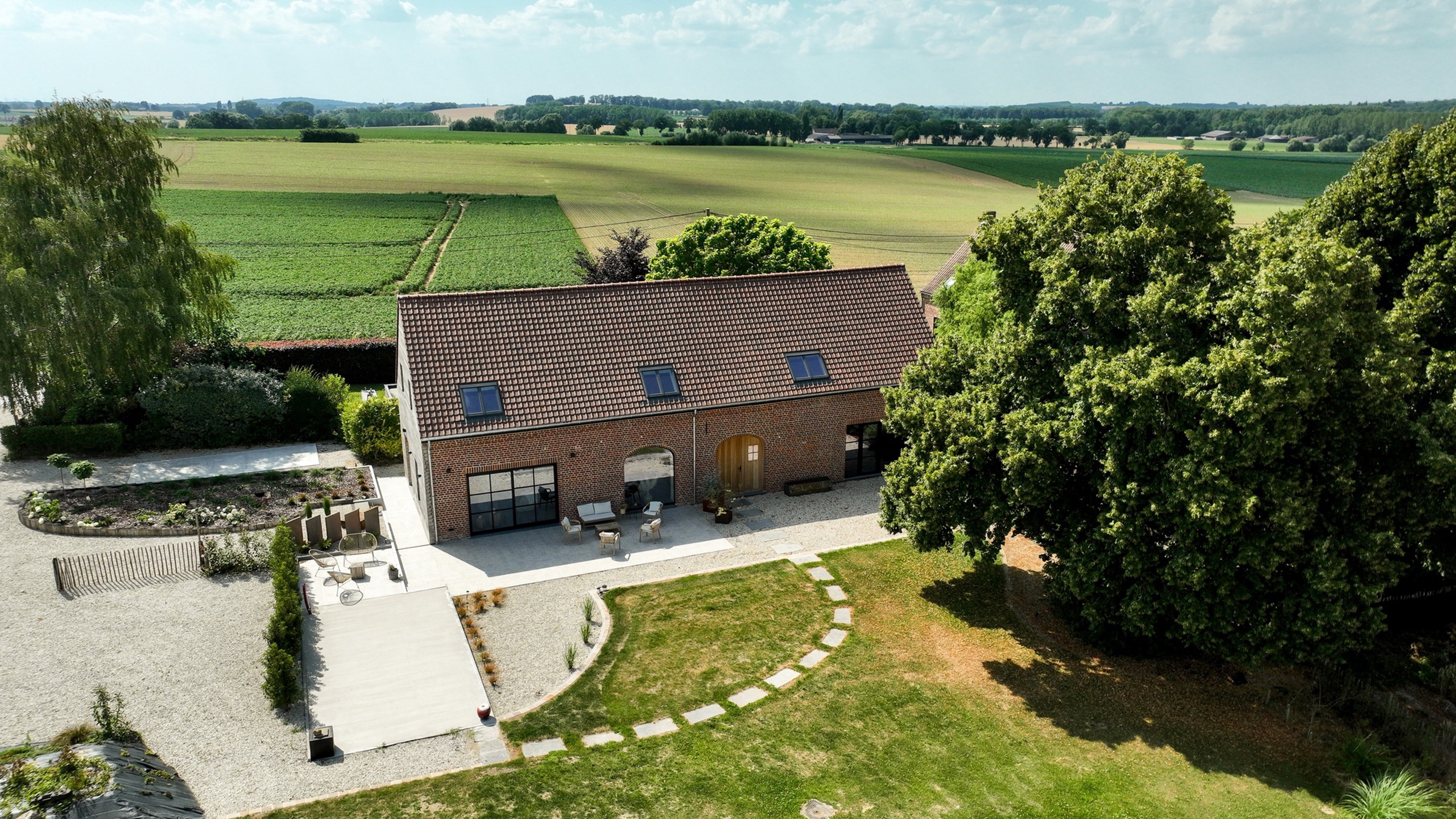 À l’extérieur, le terrain de 38 ares est entièrement aménagé : jardin arboré, vue sur les champs, terrasses de 50 m² et 30 m², grand parking (6 voitures), avec pré-installation pour borne de recharge et portail électrique.
