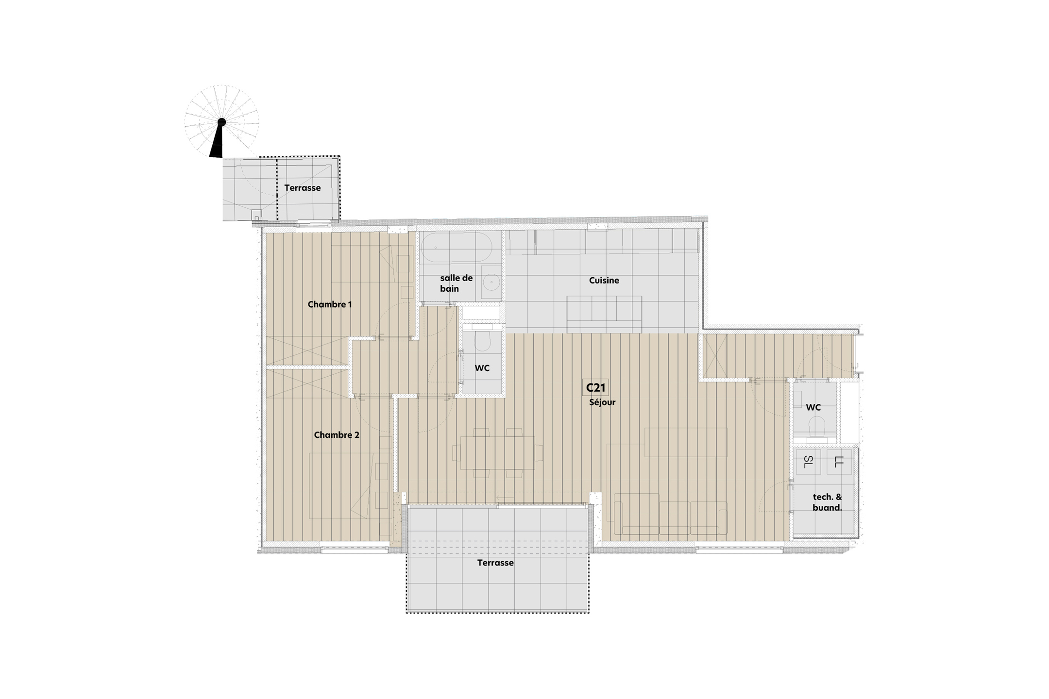 hall d’entrée, buanderie, 2 WC séparés dont 1 avec lave-mains, séjour avec cuisine ouverte, 2 chambres, salle de bain avec meuble simple
