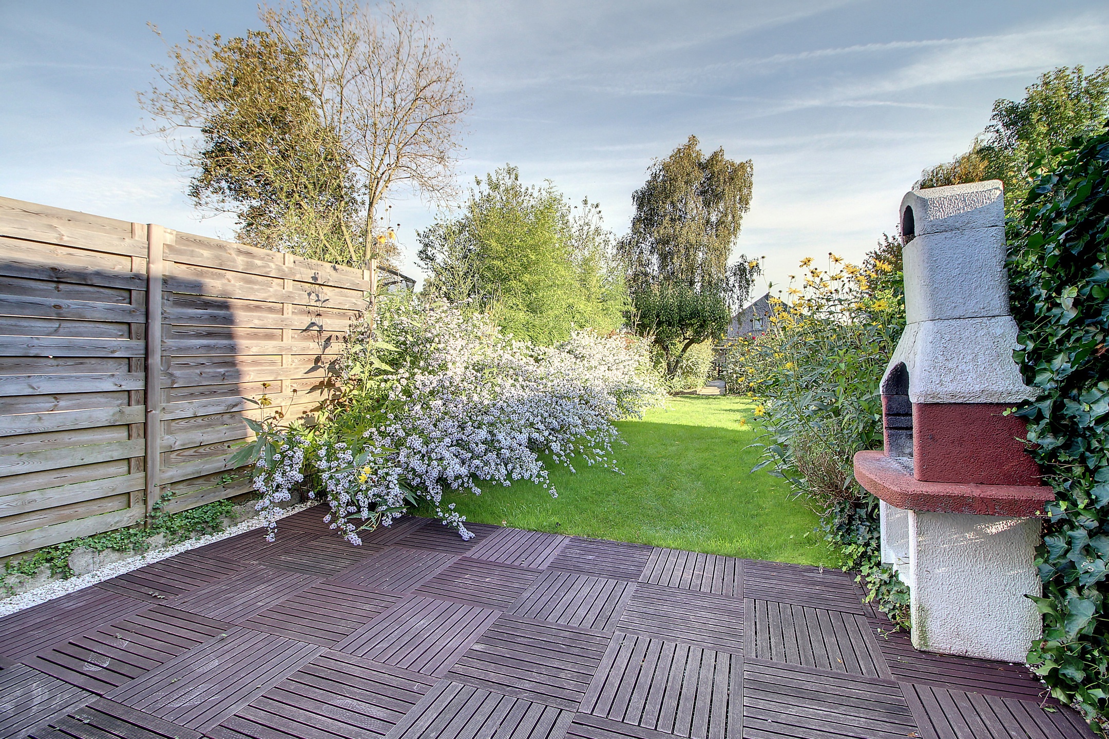 Extérieur : Terrasse en bois, un beau jardin arboré et clôturé, un abri de jardin en bois.