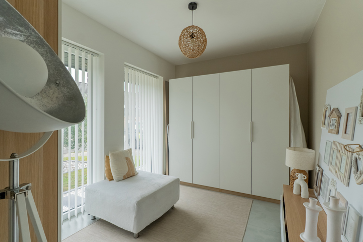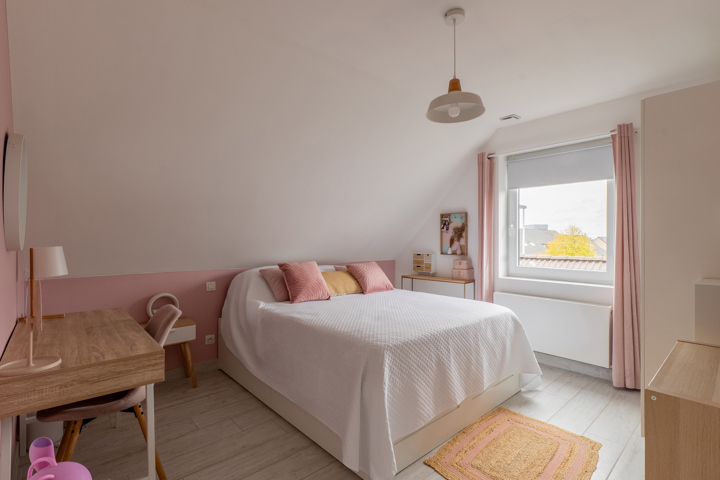 Dès l’entrée, un bel hall avec escalier apparent donne le ton : volumes, lumière et finitions haut de gamme. Le rez-de-chaussée offre un bureau ou chambre d’appoint, un WC suspendu, et une spacieuse pièce de vie ouverte regroupant salon, salle à manger et cuisine équipée bénéficiant d’une superbe vue sur le jardin. S’ajoutent un garage une voiture avec espace chaufferie et buanderie.