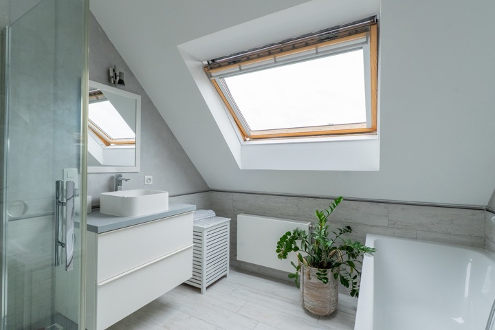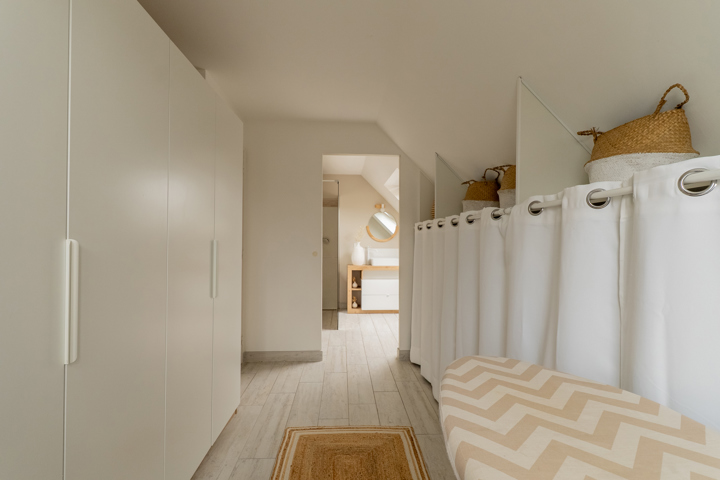À l’étage, le hall de nuit dessert une suite parentale élégante comprenant chambre, dressing et salle de bains privative avec douche à l’italienne, meuble lavabo, WC suspendu et sèche-serviette. Deux chambres supplémentaires de 13 m² et une seconde salle de bains complète viennent parfaire cet espace nuit.