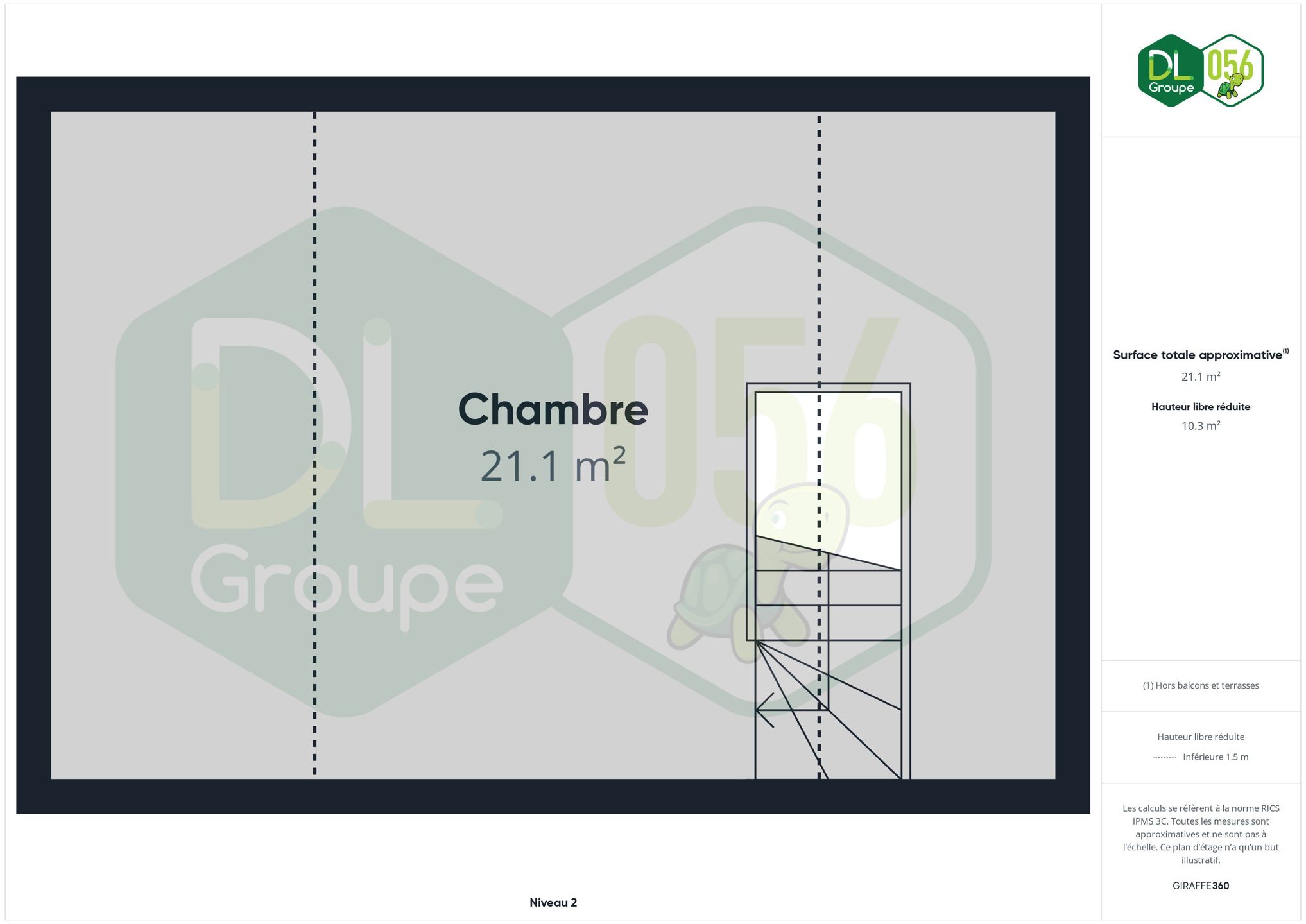 Au 2ème étage : Grenier aménagé en une 2e chambre à coucher de 21m2, accessible par un escalier fixe situé sur le hall de nuit.