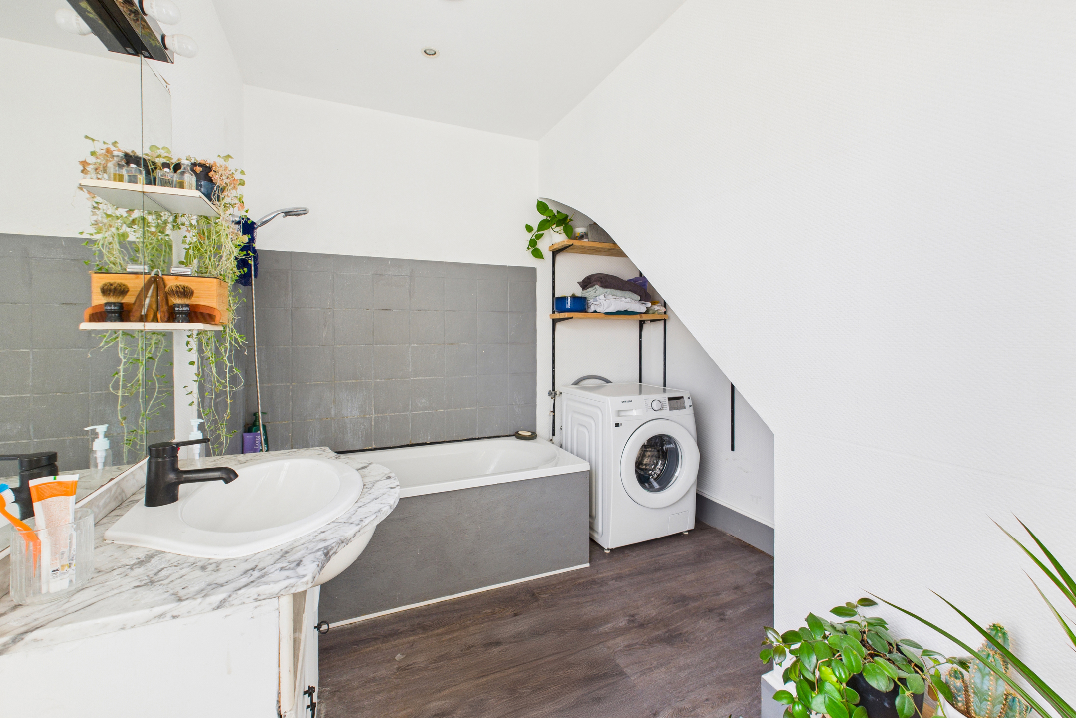 Au 1er étage : Hall de nuit desservant une grande chambre à coucher de 14m2, une salle de bains composée d’une baignoire/douche, d’un meuble lavabo et d’un coin laverie.