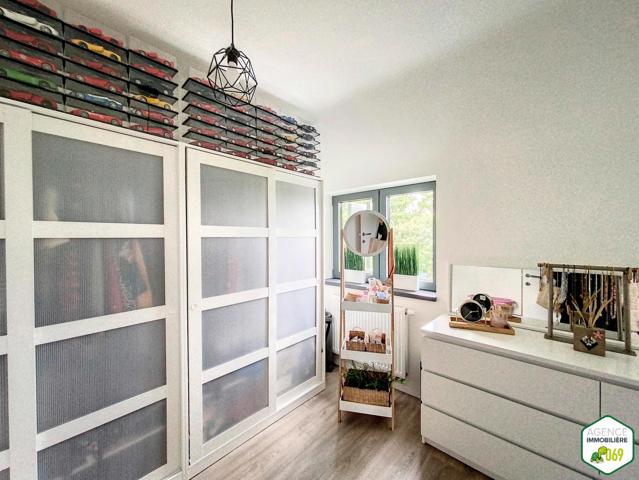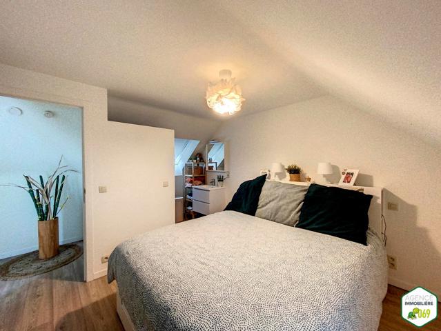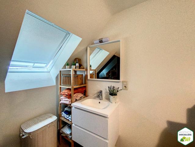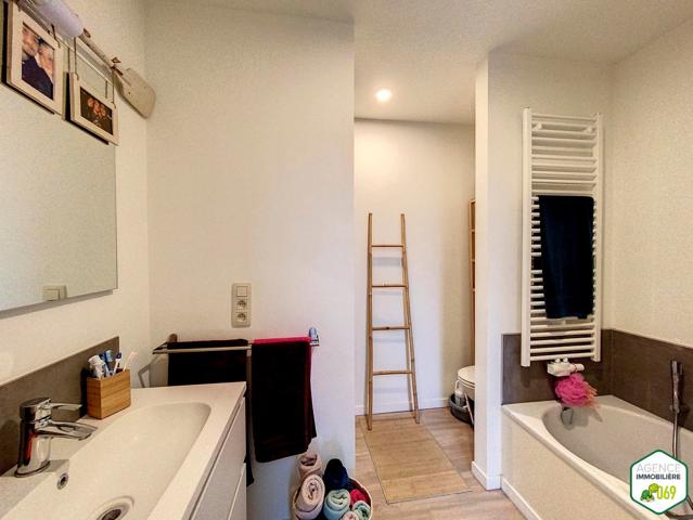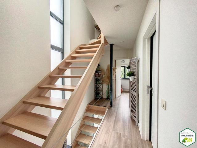 Hall d`entrée ouvert sur le séjour,WC séparé suspendu avec lave mainsCoin vestiaire,Agréable séjour avec escalier apparent, Cuisine équipée ouverte avec four, four à mirco-ondes, hotte, plaques de cuisson à induction, lave-vaisselle, réfrigérateur avec freezer et meubles de rangement,BuanderieGrand jardin avec terrasse.Parking privatif en façade. 1er Etage :Hall de nuit,salle de [..]