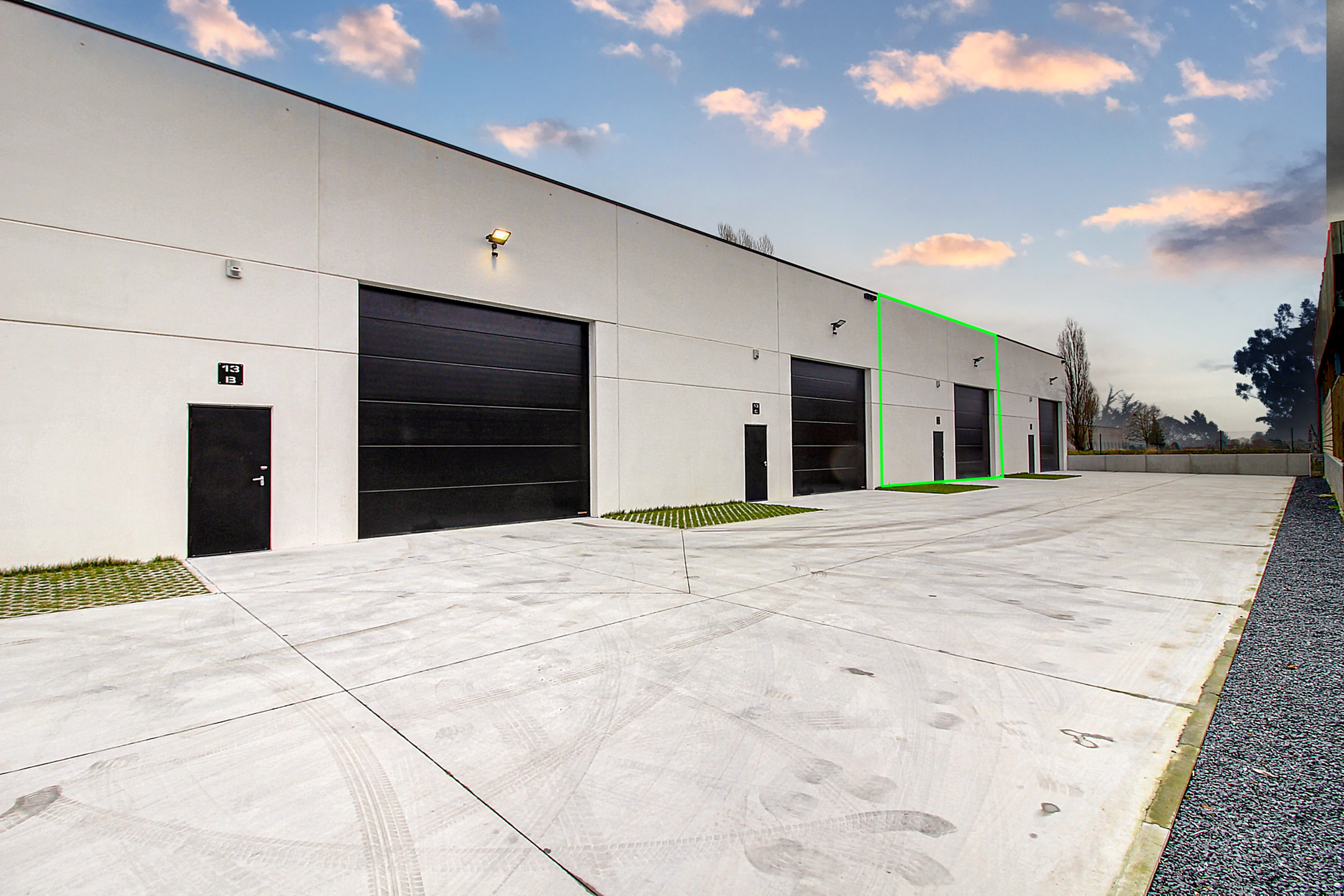 Un emplacement de parking devant chaque entrepôt.