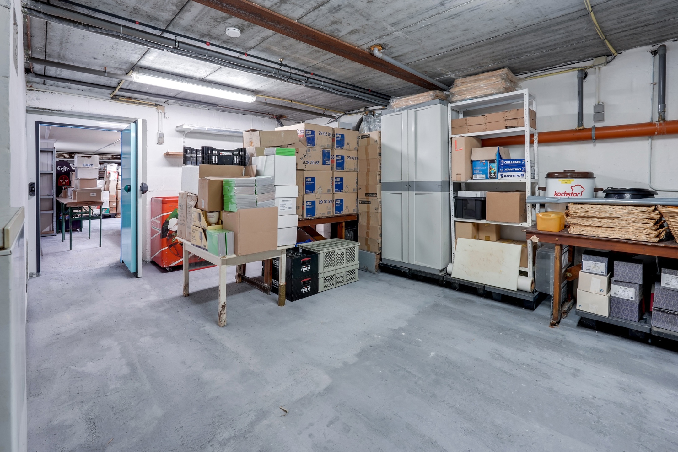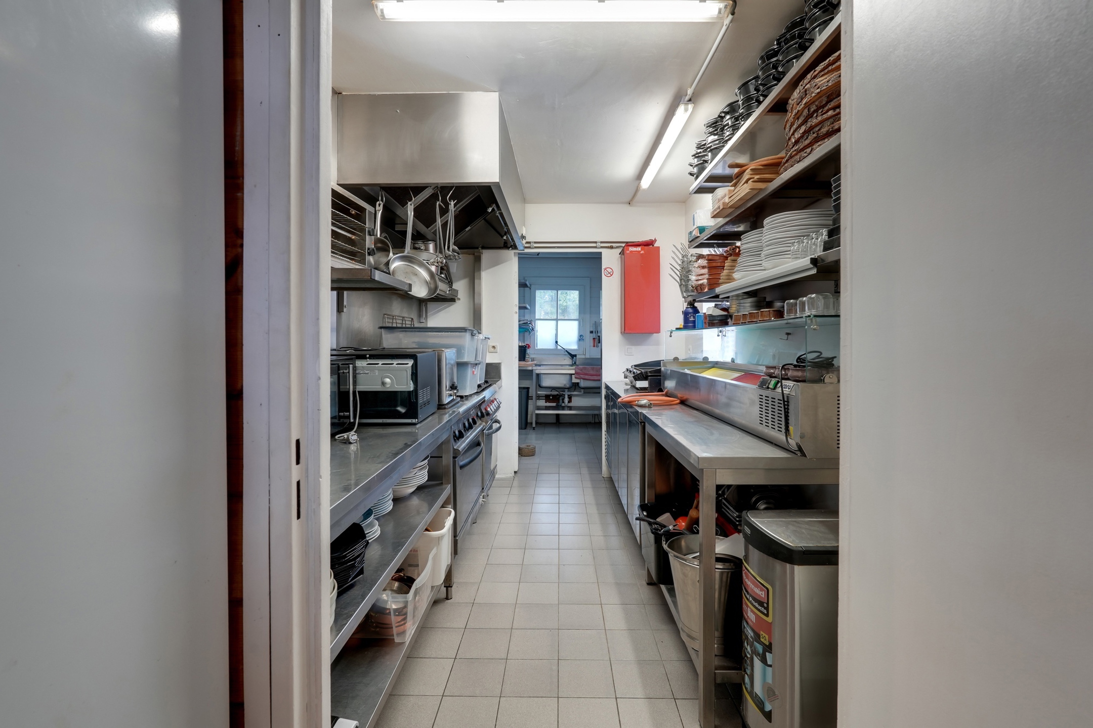 De achterkeuken leidt naar een verdieping die momenteel wordt gebruikt als kleedruimte voor het personeel. Deze omvat een douche en een bureau.