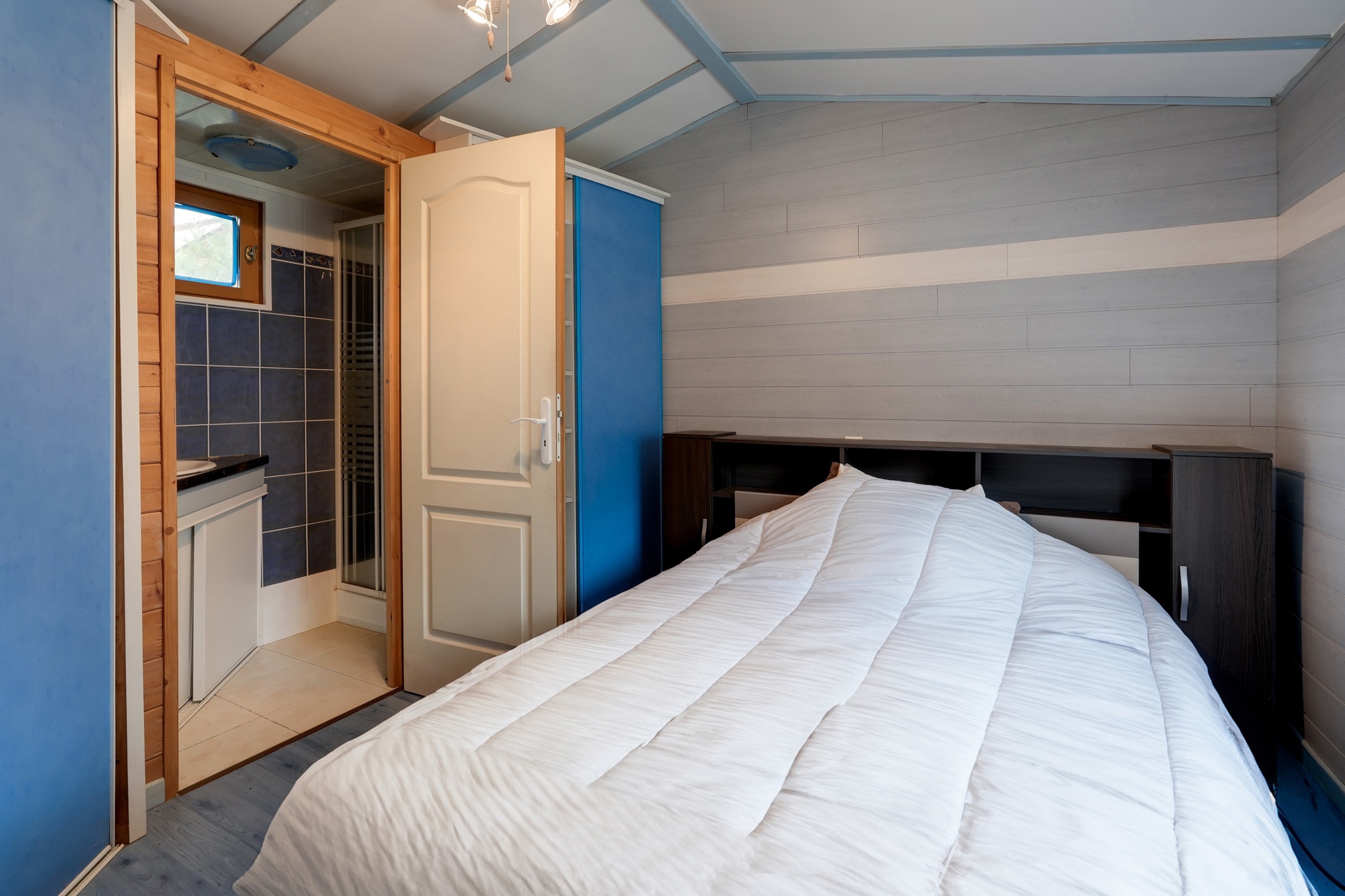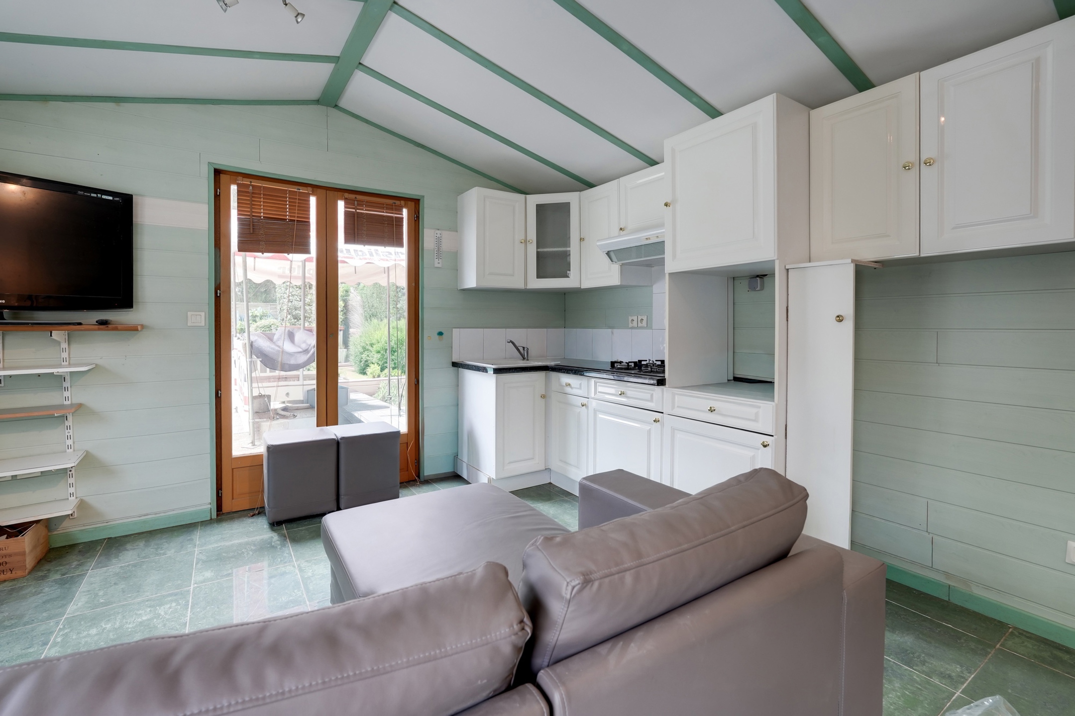 Een apart chalet vervolledigt het geheel. Het omvat een keuken, een slaapkamer, een badkamer en een apart toilet — ideaal voor de inrichting van een kleine studio.