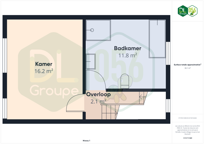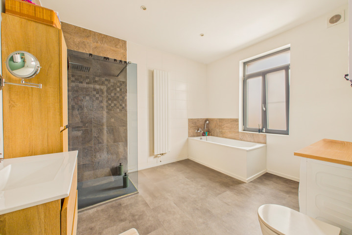 Au premier étage, vous trouverez une chambre spacieuse et une salle de bains élégante, équipée d’une douche à l’italienne, d’une baignoire, d’un meuble lavabo moderne, d’un WC suspendu et d’un espace buanderie pratique.