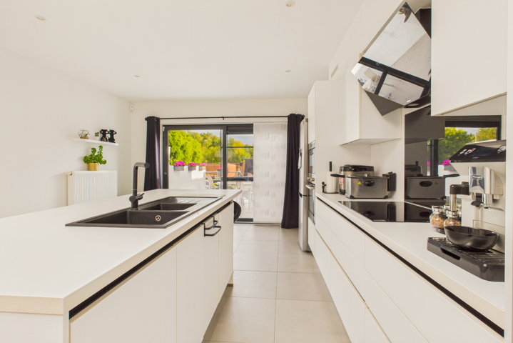 À l’entrée, vous serez accueilli par un hall spacieux, avec sur la gauche un bureau pratique ou un espace de rangement supplémentaire. Le hall s’ouvre harmonieusement sur le séjour lumineux et ouvert, offrant de nombreuses possibilités pour un coin salon convivial et un espace repas. La cuisine ouverte attenante est entièrement équipée d’une plaque à induction, d’une hotte, d’un four, d’un micro-ondes, d’un lave-vaisselle et d’un évier double. Un WC invité complète ce niveau.