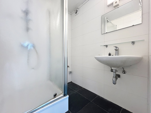 Salle de bain avec douche, lavabo et espace buanderie,
