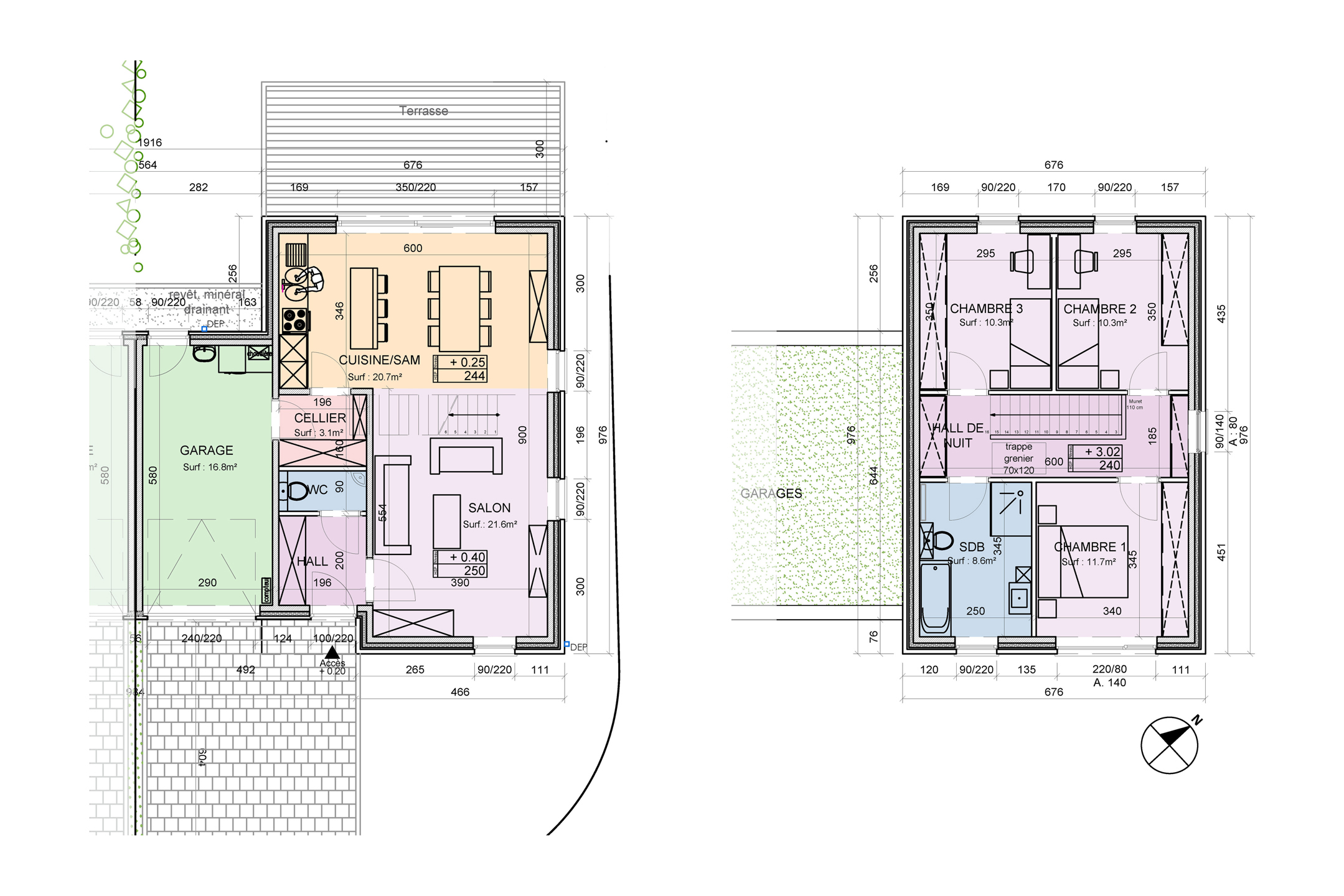 - Agencement (étage) : 3 chambres, salle de bain avec baignoire, douche 120 x 90 cm, meuble vasque, miroir et WC