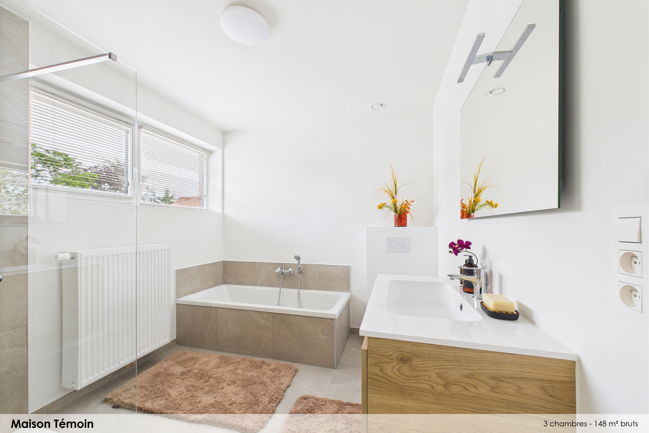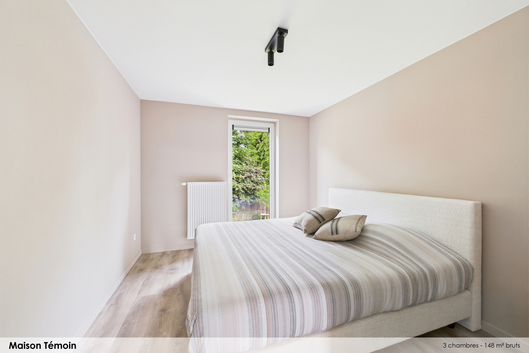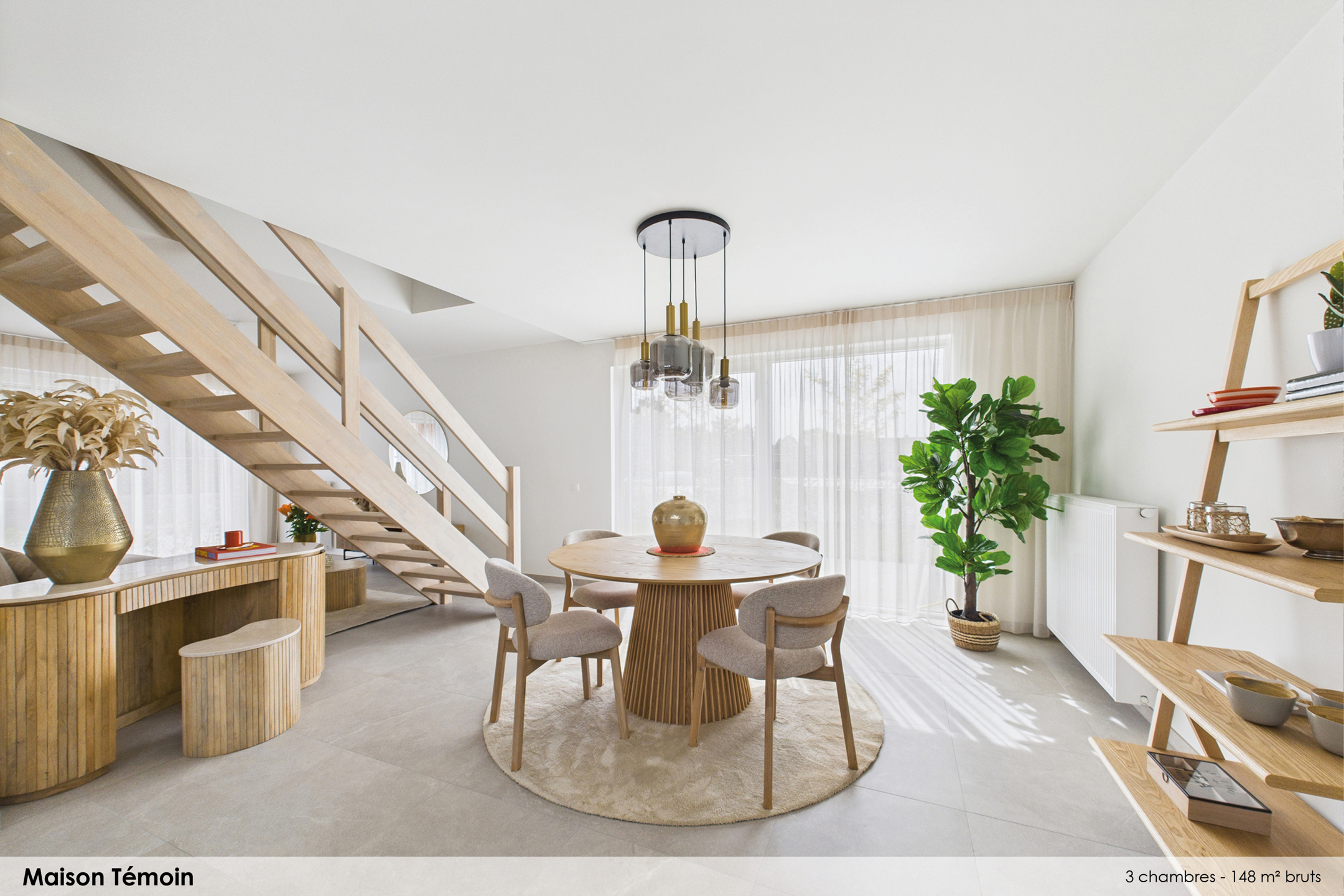 Maison Témoin : murs peints, terrasse et devanture, clôtures avec brise vue, parquet dans les chambres, finitions de la salle de bains, pelouse semée et haies déjà plantées