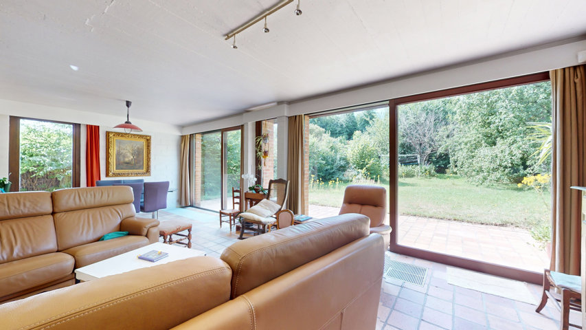 • Séjour lumineux d’environ 35 m² avec poêle à bois, ouvrant sur une belle terrasse de ± 30 m² et le jardin